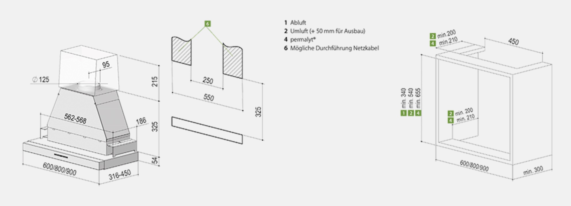 - Empf. Abstand zum Kochfeld in cm: 55 (Gaskochfeld > 65)