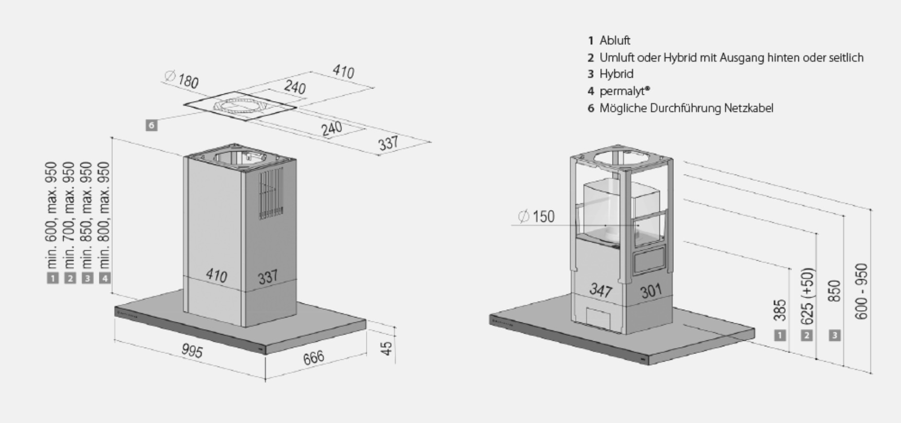 - Individuelle Schachthöhen ohne Aufpreis in 50 mm Schritten von 600 mm bis 950 mm für den Abluftbetrieb und 700 bis 950 für den Umluftbetrieb