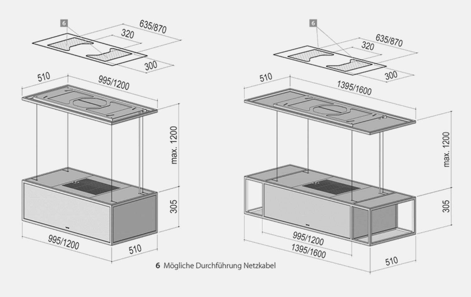 - Seillänge individuell verlängerbar für hohe Räume; Haube schwebt auf Höhe der Seilverlängerung unter der Decke