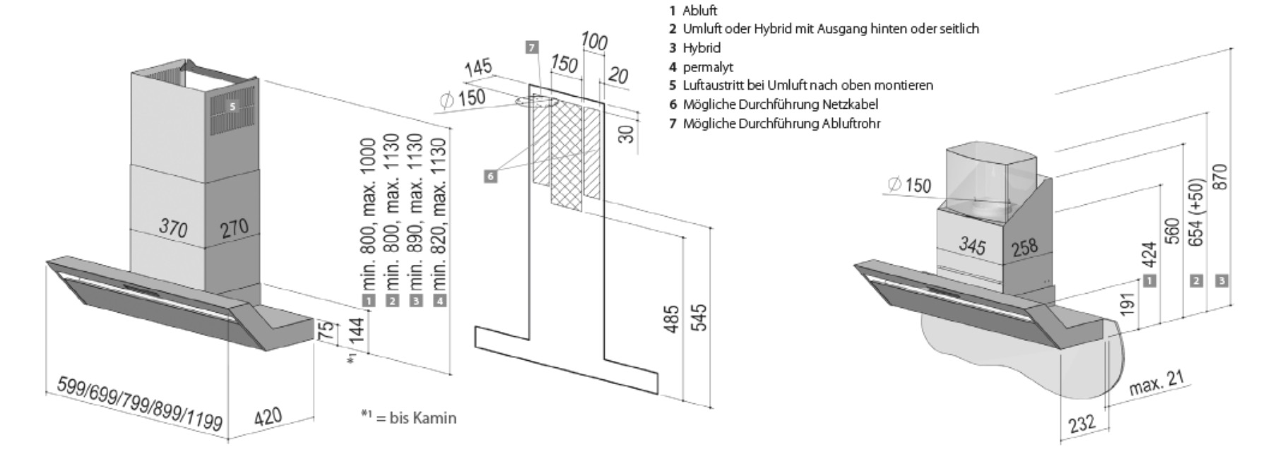 - Netzanschluss 230 V (Steckdose) hinter dem Haubenkamin einplanen