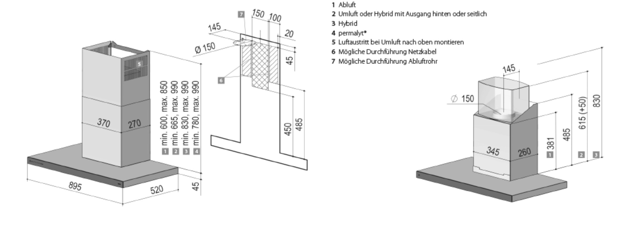 - Mindesthöhe Schacht für Umluftfilter: 665 mm