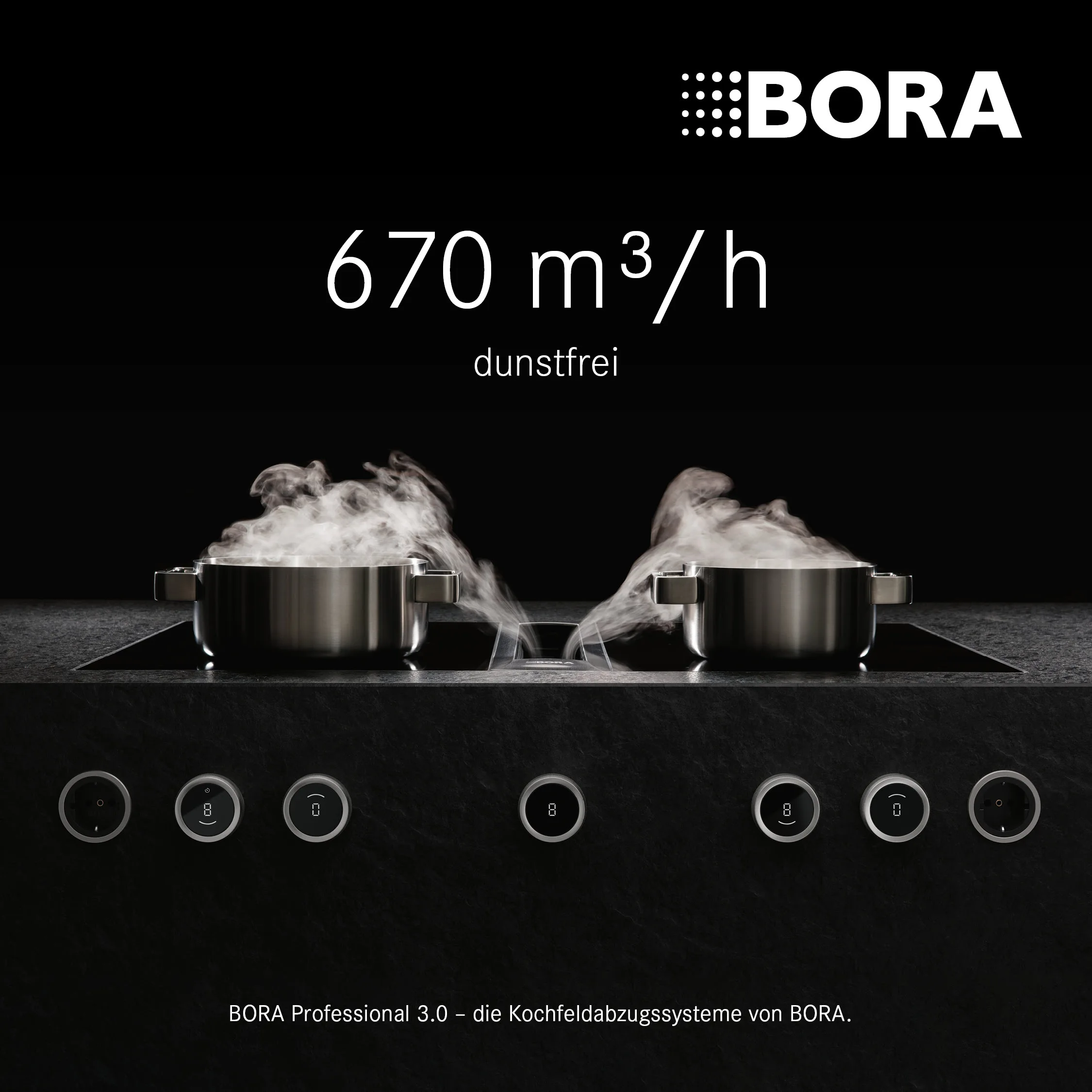 Das BORA Professional 3.0 hat eine maximale Abzugsleistung von 670 m ³/h und maximal 70 dB Geräuschpegel.