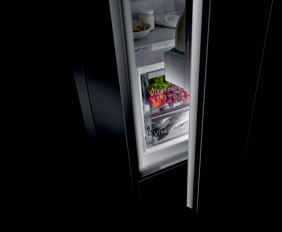 Bosch accent line carbon black Kühl- & Gefriergeräte bieten deinen Lebensmitteln ein stilvolles Zuhause. VitaFresh pro Frischeschubladen mit zwei unterschiedlichen Klimazonen halten deine Lebensmittel bis zu 3x länger frisch. FreshSense Sensoren kontrollieren und steuern permanent die Umgebungs-, Kühlschrank- und Gefrierschranktemperatur. Dank NoFrost gehört Abtauen der Vergangenheit an.