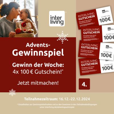 - 4. Gewinn: 16.12.–20.12.2024 – 4x 100 € interliving-Gutscheine