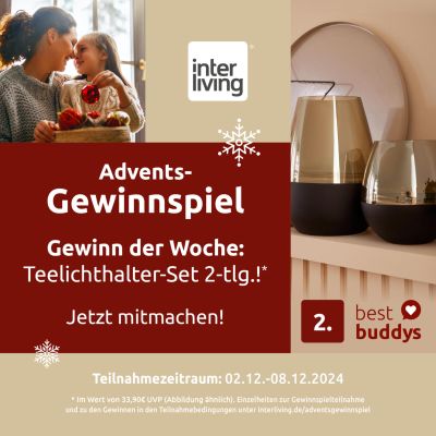 Weihnachtszeit ist Gewinnspielzeit – und dieses Jahr wird es bei interliving besonders spannend! Vom 25. November bis zum 20. Dezember 2024 laden wir Sie ein, an unserem großen Advents-Gewinnspiel teilzunehmen. Freuen Sie sich auf fantastische Preise, die Ihnen das Warten auf Weihnachten versüßen!