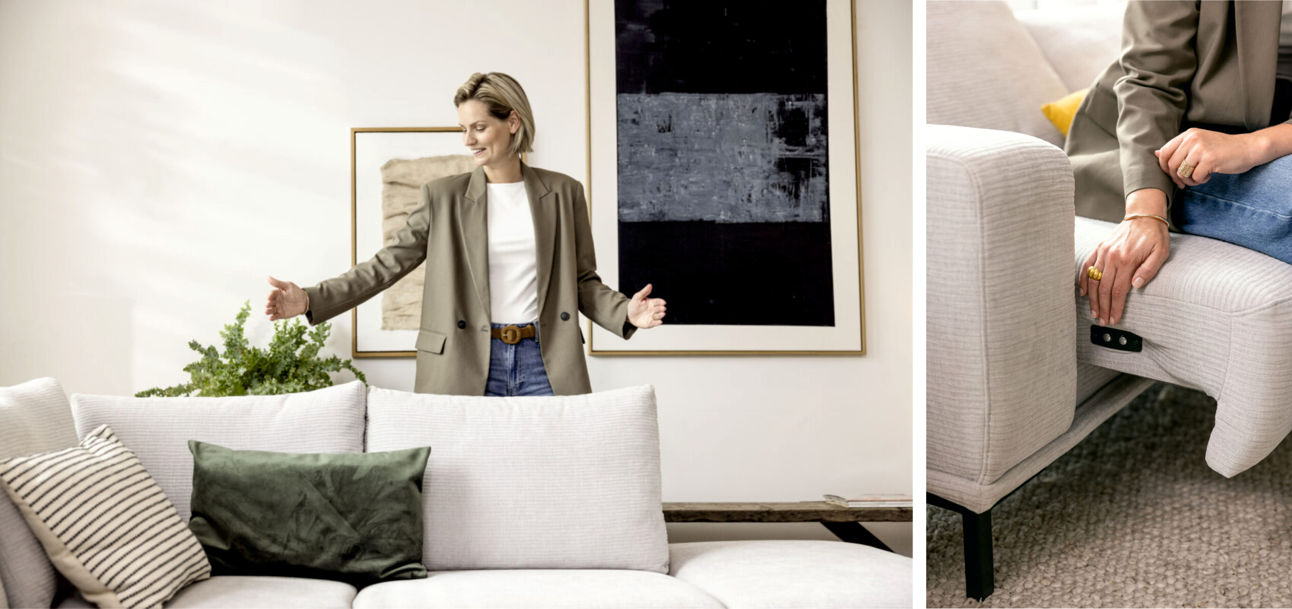 Für mich war klar, dass mein Sofa schick und praktisch sein sollte. Besonders wichtig war mir die Maßanfertigung im 10-cm-Raster, die mir geholfen hat, das Sofa perfekt an die Wand neben meinem Kamin anzupassen und den erforder- lichen Sicherheitsabstand einzuhalten. Die elektrische Sitztiefenverstellung ist super – so kann ich den Sitz perfekt anpassen, egal ob beim Lesen oder Filmabend mit Freunden. Bei der Auswahl der Füße habe ich mich für elegante schwarze Füße entschieden, die dem Sofa einen modernen Touch verleihen. Der weiche Strukturstoff macht es noch gemütlicher und sorgt dafür, dass ich nach einem langen Arbeitstag immer wieder gerne zurückkehre.”