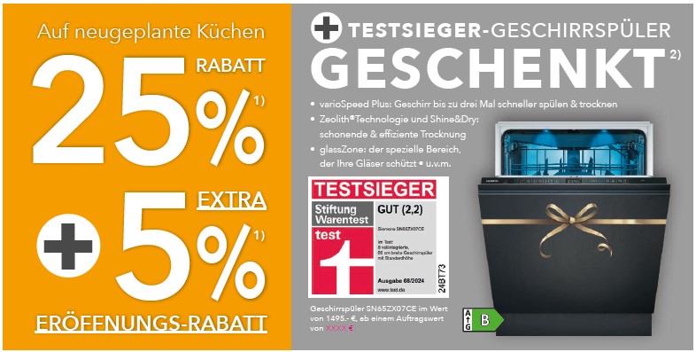- 25% Rabatt + 5% Eröffnungs-Rabatt EXTRA auf neugeplante Küchen1)
