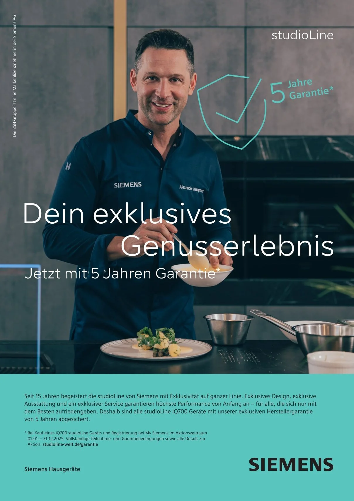 Exklusiv. Innovativ. Abgesichert. Seit 15 Jahren begeistert die Siemens studioLine mit außergewöhnlichem Design, erstklassiger Ausstattung und Premium-Service. Jetzt setzt Siemens noch einen drauf: Alle studioLine iQ700 Geräte kommen mit einer 5-Jahres-Herstellergarantie! So einfach geht’s: Kauf dein neues Gerät im Aktionszeitraum (01.01. – 31.12.2025) und registriere es innerhalb von zwei Jahren nach der Lieferung bei My Siemens. Und schon bist du abgesichert – für noch mehr Performance, die begeistert.