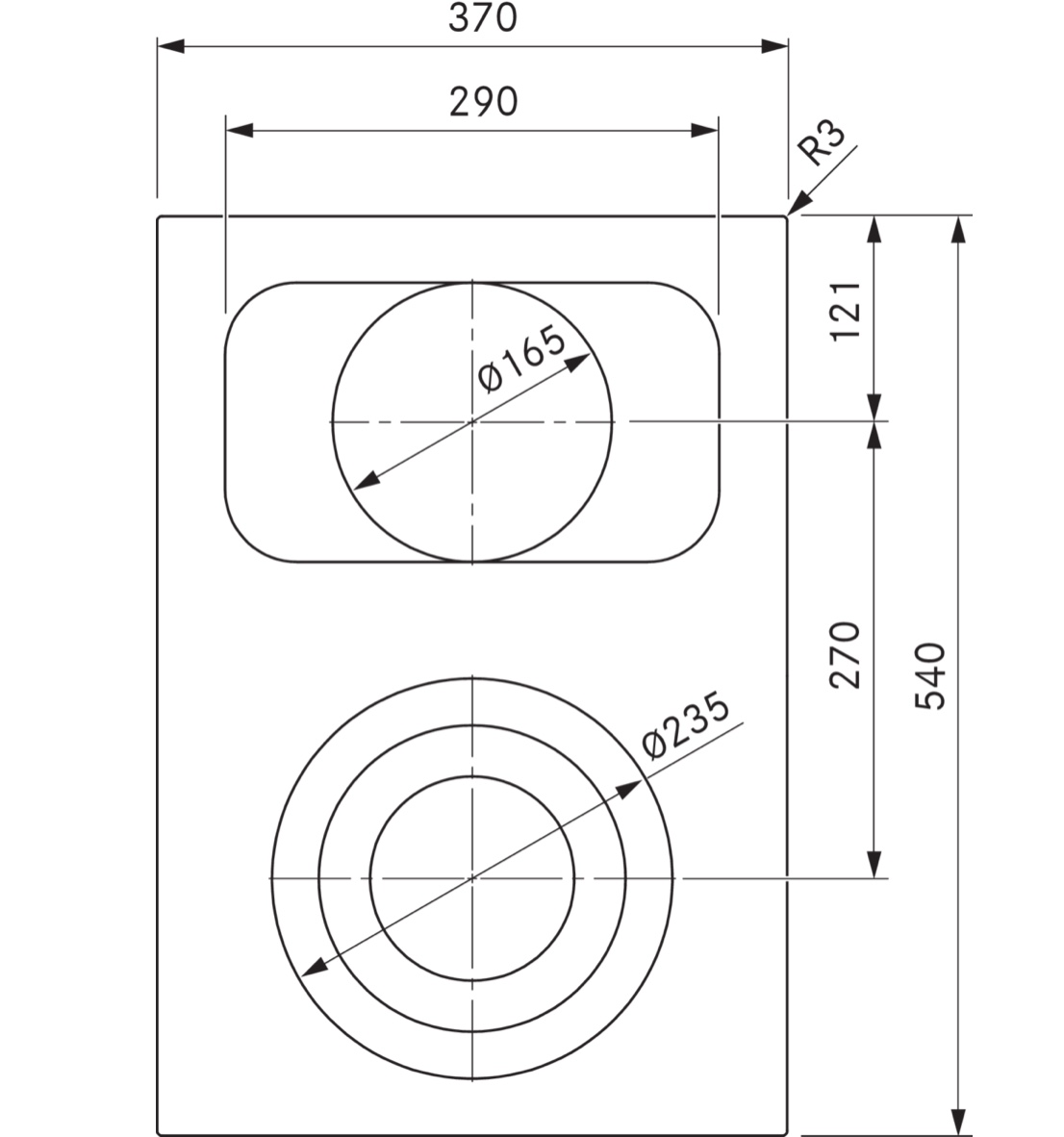- Größe Kochzone hinten: Ø 165 / 290 x 165 mm