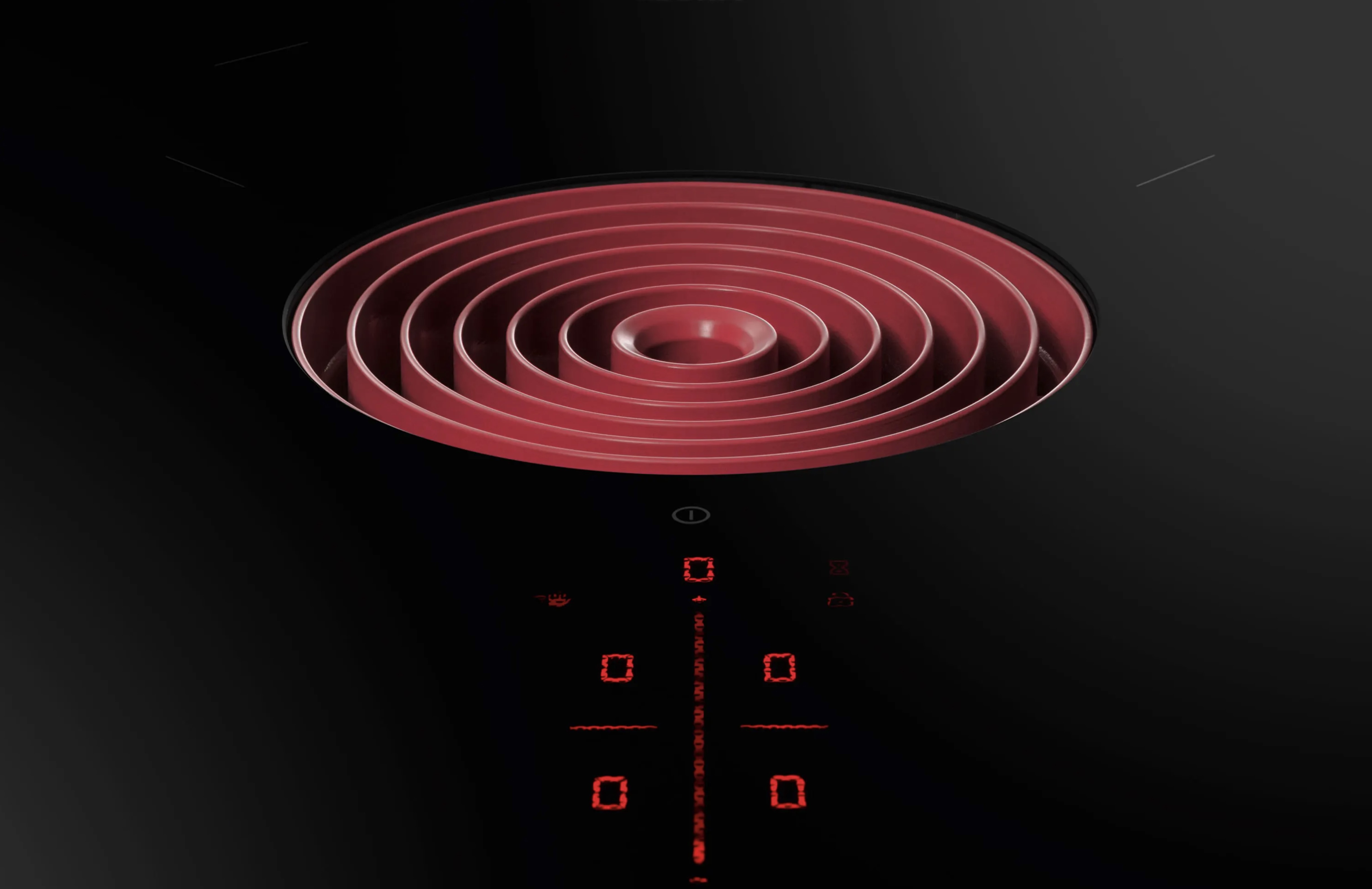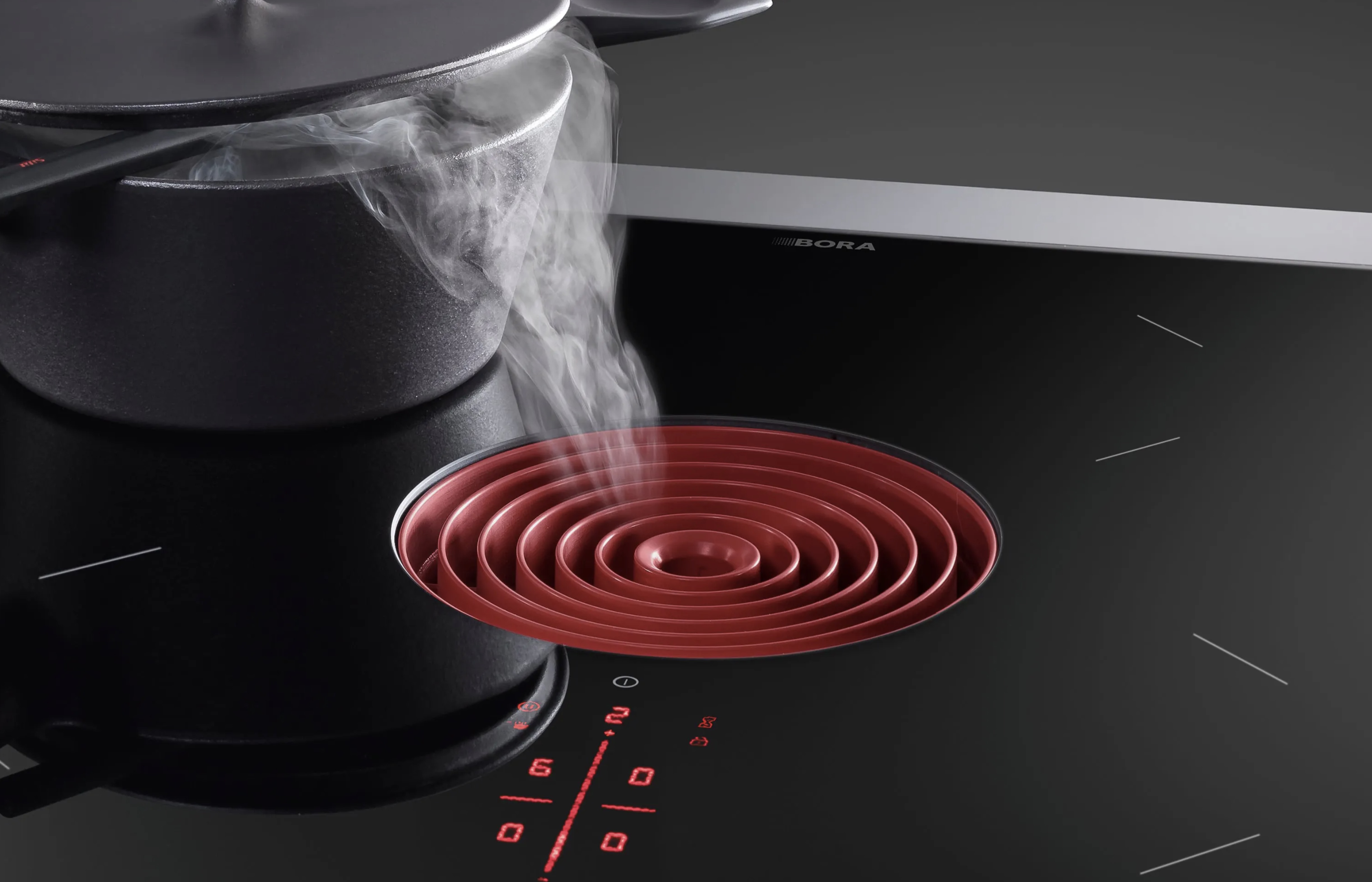 - Die BORA Pure Einströmdüse zentriert sich dank konischer Führung automatisch und ohne Verrastung im Kochfeld.