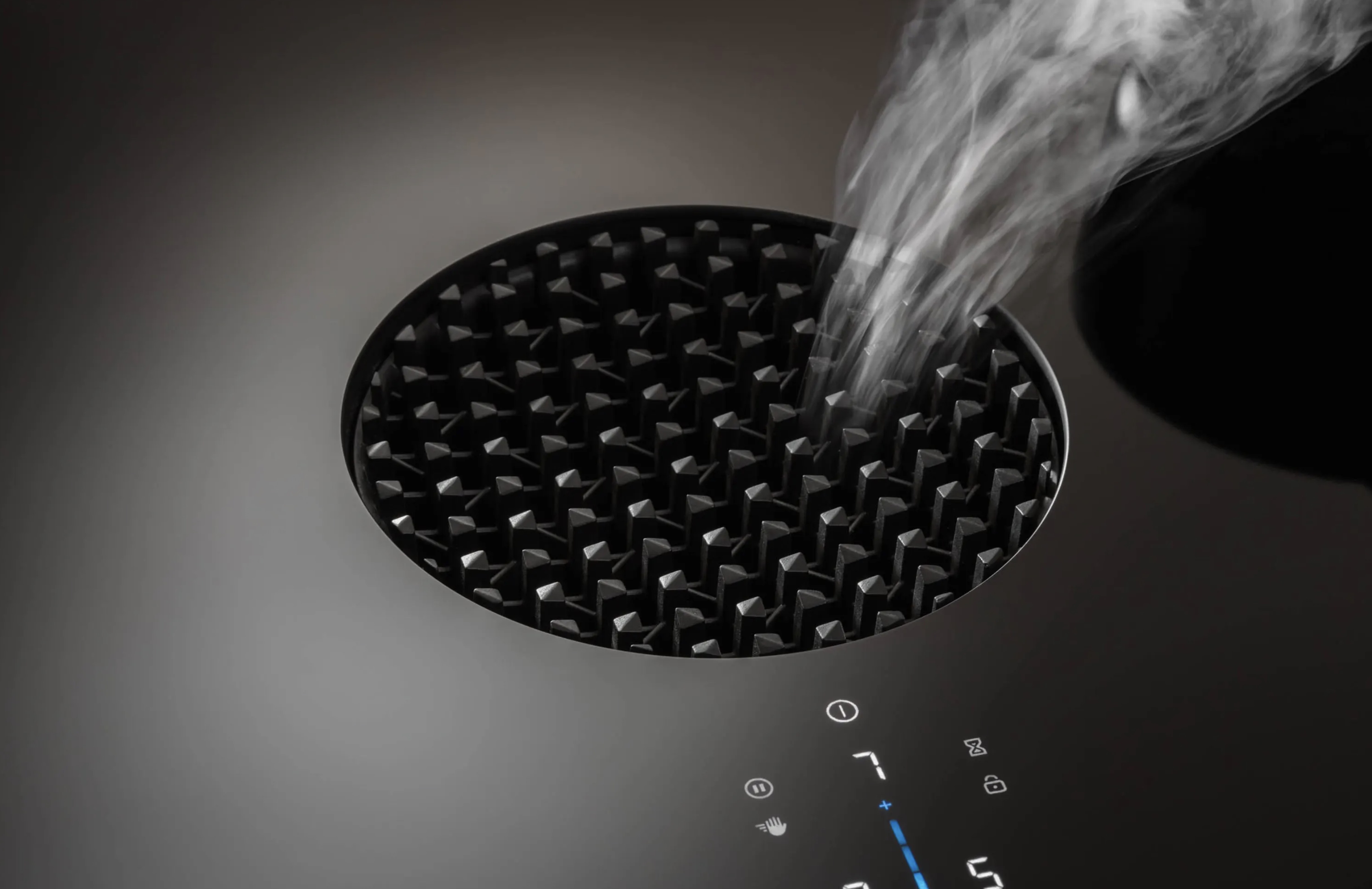 Die Einströmdüse liegt flächenbündig im Kochfeld und bietet so eine hochelegante Integration in jede moderne Küchenarchitektur. Die dem Kochdunst ausgesetzte Einströmdüse lässt sich leicht über einen Kippmechanismus entnehmen und kann in der Spülmaschine gereinigt werden.