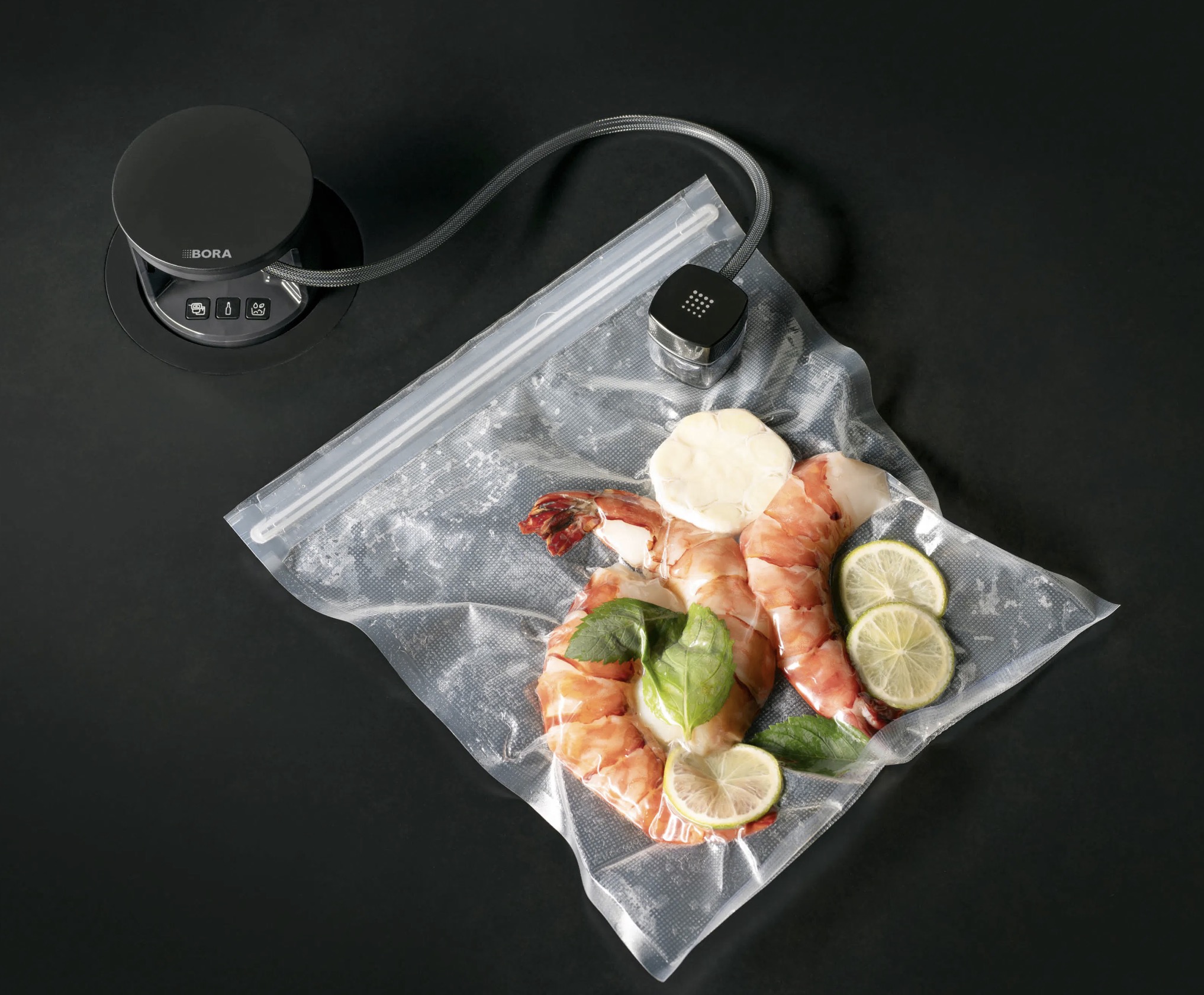 - Lebensmittel länger haltbar machen und dabei den vollen Geschmack beibehalten – im BORA QVac Vakuumierbeutel mit einem Fassungsvermögen von 0,6l bis 2,1l ist dies möglich. Außerdem sind die Lebensmittel in den Vakuumierbeuteln perfekt für das Sous-vide-Garen vorbereitet. Die Vakuumierbeutel können, je nach zuvor vakuumierten Lebensmitteln, mehrmals wiederverwendet werden.