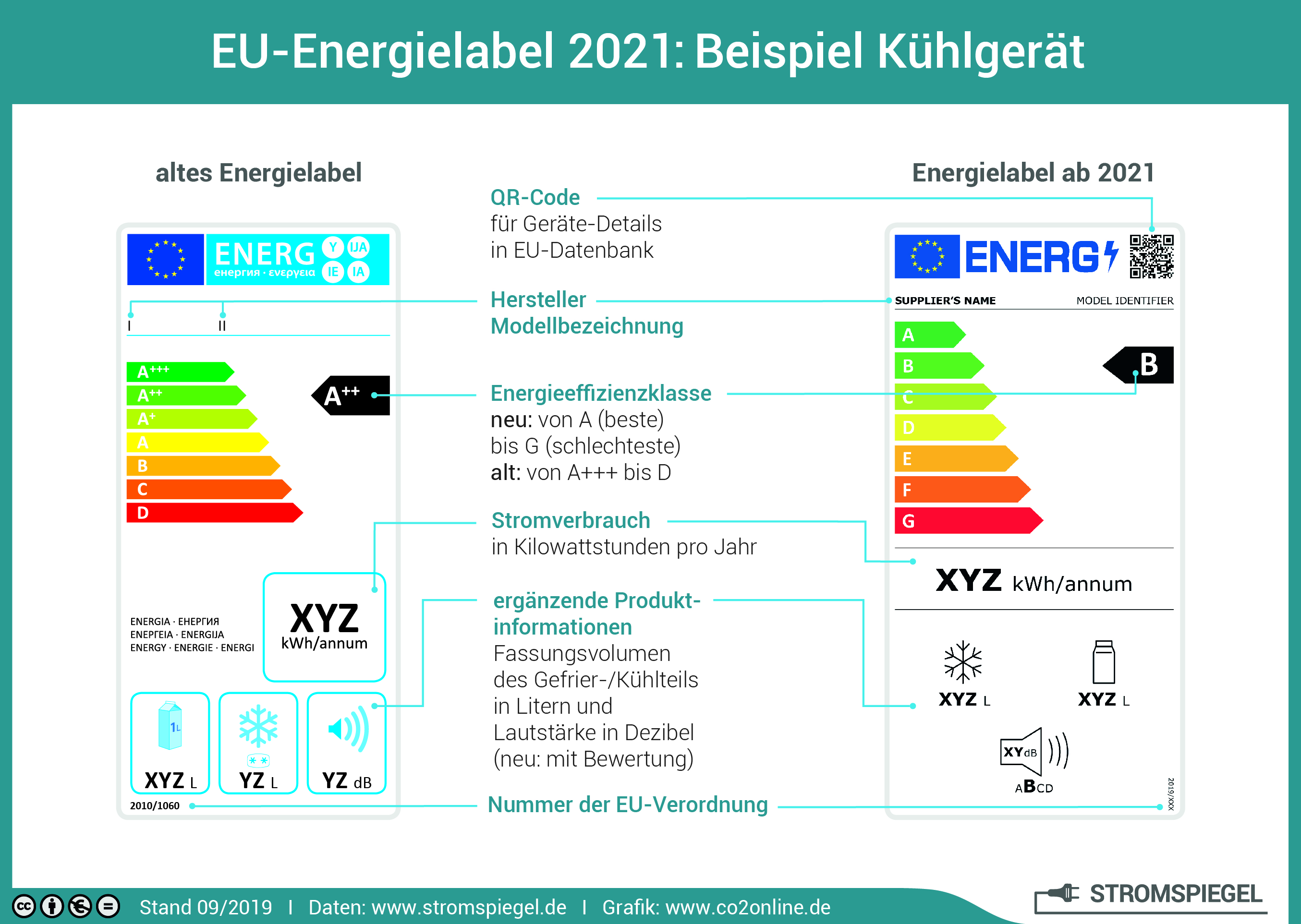 Zusätzlich zur Energieeffizienzklasse sind bei Kühl- und Gefriergeräten auch noch der Energieverbrauch in kWh pro Jahr, das Nettovolumen des Kühlschranks, das Nettovolumen des Gefrierschranks und die maximale Geräuschentwicklung in Dezibel angegeben.