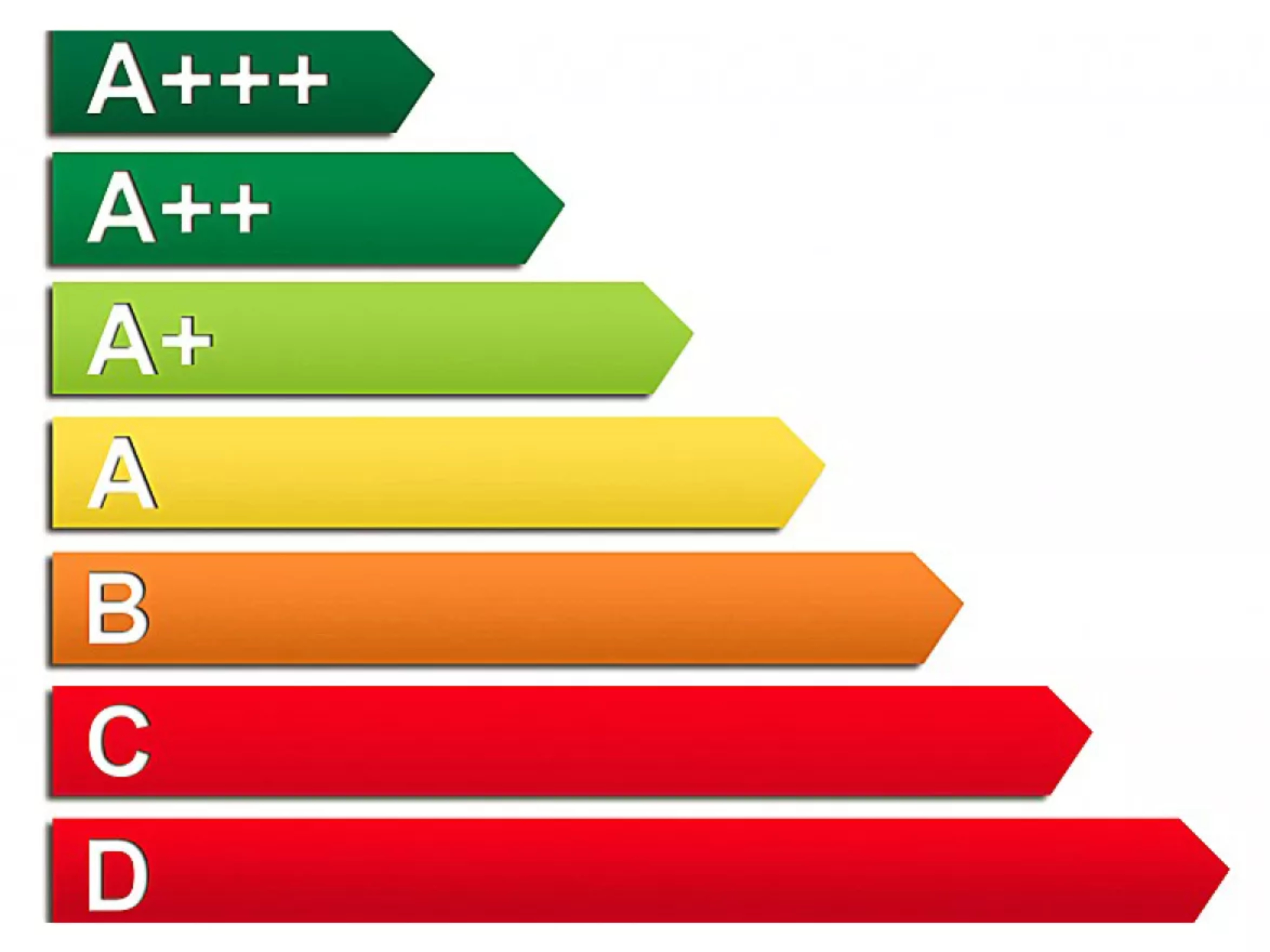 Um Ihnen eine einfache Einschätzung der Energieeffizienz des jeweiligen Küchengerätes und einen direkten Vergleich zu ermöglichen, existiert eine einheitliche Skala, eine Klassifizierung in Energieeffizienzklassen von A+++ bis D. Dabei ist D der schlechteste Wert, A+++ im Normalfall der beste. Einzige Ausnahmen sind der Elektrobackofen und der Wäschetrockner. Bei diesen beiden reicht die Skala nur von A (bester Wert) bis G (schlechtester Wert). Bei Kühl- und Gefriergeräten, Geschirrspüler und Waschmaschinen gilt hingegen seit 2011 A+++ als beste Energieeffizienzklasse.