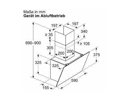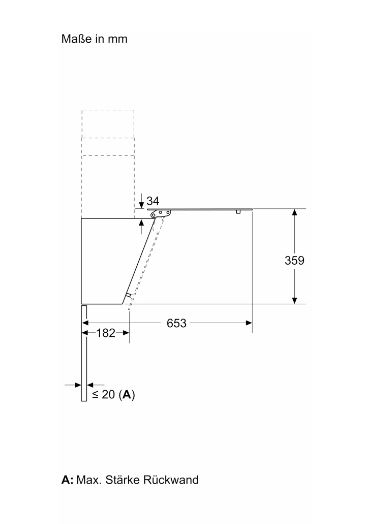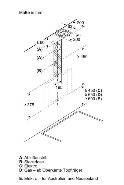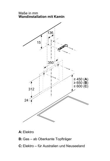 Mindestens 450 mm Abstand bei Elektro-Kochfeldern einhaltenMindestens 650 mm Abstand bei Gaskochfeldern einhalten.