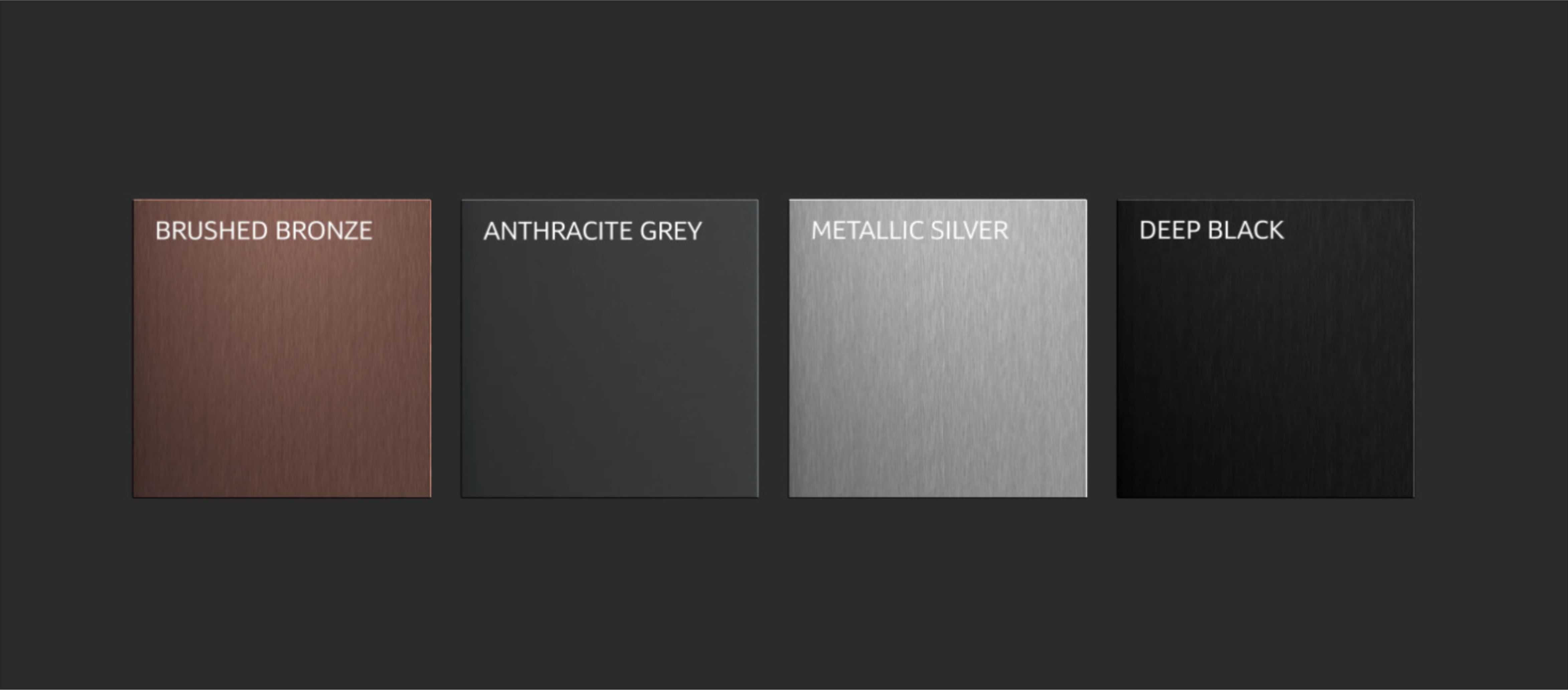 Entfesseln Sie Ihre Kreativität mit Flex Design! Verleihen Sie Ihren Küchengeräten eine ganz persönliche Stil-Note, indem Sie aus 4 faszinierenden Farben für die Seitenleisten und Griffe wählen. Von Deep Black über Anthracite Grey bis hin zu Metallic Silver und Brushed Bronze - wählen Sie Ihre Farbe für Backofen, Kochfeld, Kochfeldabzug, Kaffeevollautomat oder Dunstabzugshaube und gestalten Sie Ihre Küche ganz nach Ihrem individuellen Stil..