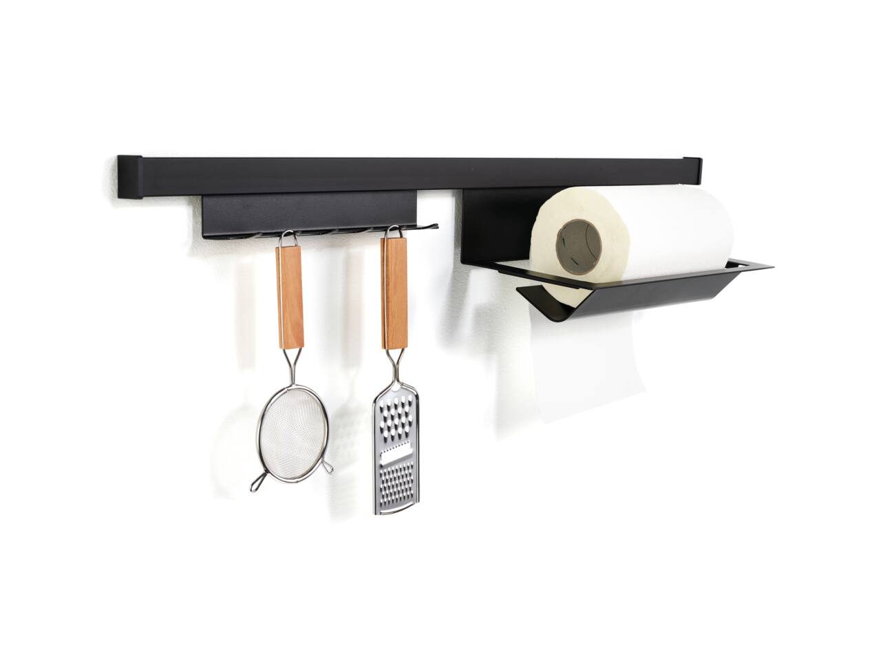 Das Küchenreling Linero EasyLine Set-3 aus Aluminium setzt einen modernen Akzent im Nischenbereich und bietet zugleich einen praktischen Mehrwert. Dank der mattschwarzen Oberflächen fügt es sich harmonisch in das Gesamtbild der Küchenzeile ein. Das Relingsystem-Set beinhaltet eine Profilleiste inklusive Endkappen sowie einen Papierrollenhalter und eine Hakenleiste. Letztere wird genutzt, um beispielsweise Kochgeschirr wie Schöpflöffel und Pfannenwender griffbereit aufzuhängen.