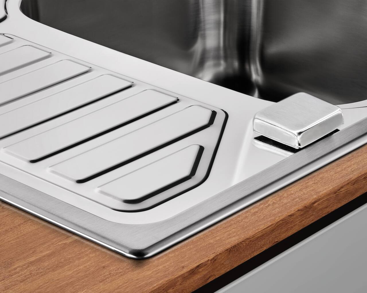 Die Einbauspüle Nava 2 ist mit einer großzügigen Abtropffläche ideal für den alltäglichen Gebrauch geeignet. Ihre Funktionalität wird um rhythmische Umrisse ergänzt, die sich auf klassisch schlichte Weise in die Küchenoptik fügt. Gleichzeitig bietet die Spüle allen Komfort bei Geschirrspülen und der Zubereitung von Speisen. Als Material kommt rostfreier Edelstahl zum Einsatz, der sich durch seine strapazierfähigen und hitzebeständigen Merkmale auszeichnet. Die porenfreie Oberfläche lässt sich unkompliziert reinigen und pflegen. Der Einbau der Spüle erfolgt aufliegend von oben und ist für alle Arten von Arbeitsplatten geeignet. Dazu ist eine reversible Ausrichtung mit Ablauffläche links oder rechts möglich.