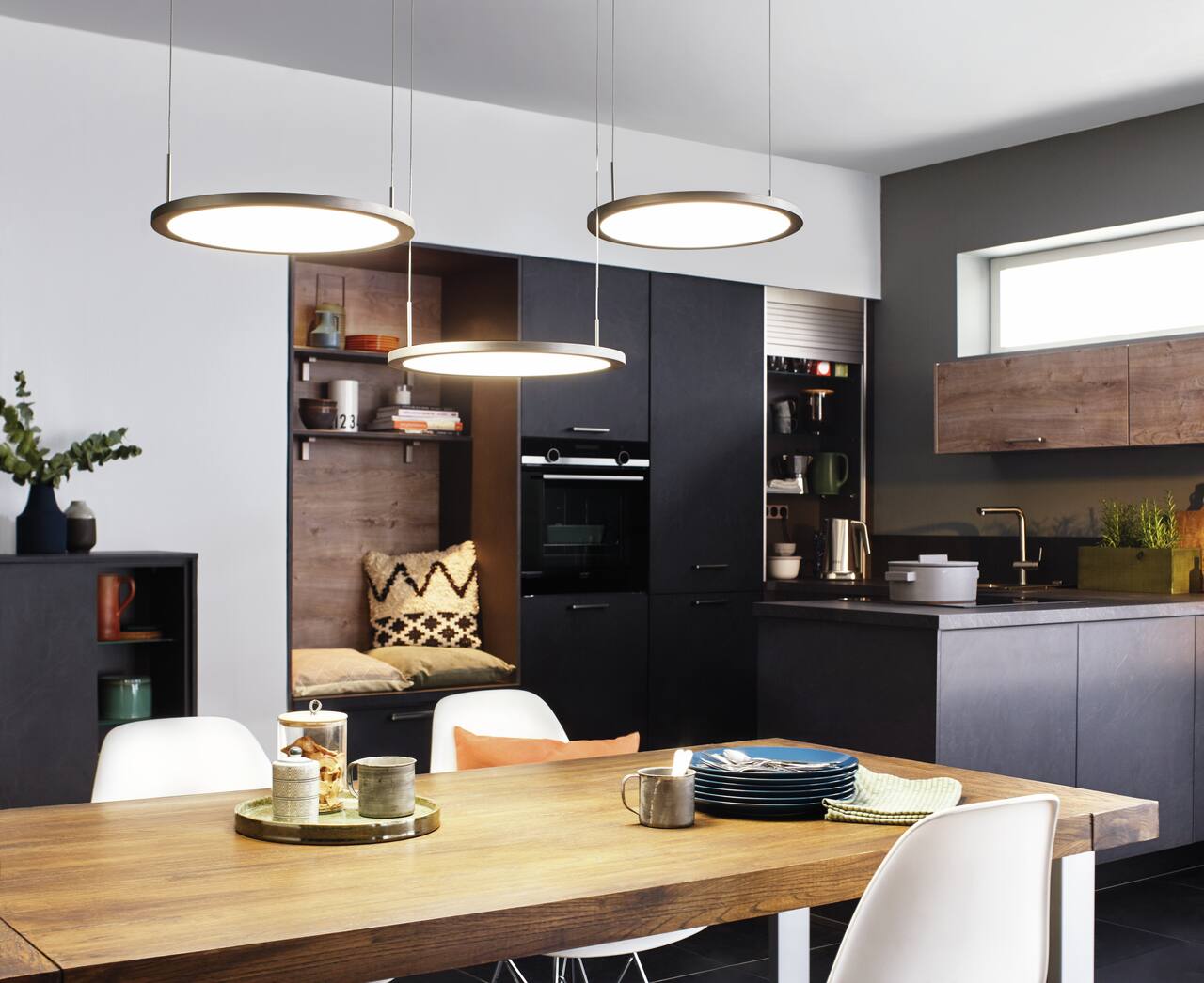 Ob über der Kücheninsel, dem Küchen- oder Esszimmertisch: Die Pendelleuchte Plate 3 LED verbreitet überall eine angenehme Lichtstimmung für gemütliche Stunden. Sie setzt auf ein modernes Design und ist mit ihren drei kreisförmigen Leuchtkörpern ein Hingucker in jeder Kücheneinrichtung. Nach den persönlichen Vorlieben können die einzelnen Elemente stufenlos verstellt werden. Mit ihrem satinierten Acrylglas und dem Gehäuse aus Aluminium besitzt die LED-Leuchte eine hochwertige und robuste Qualität. Um schöne Lichtakzente zu setzen, ist sie mit einer energiesparenden LED-Technologie ausgestattet. Auch eine hohe Lichtausbeute und geringe Wärmeentwicklung charakterisieren die Pendelleuchte. Durch die integrierte Dimmfunktion lässt sich die Helligkeit stufenlos dimmen. Über die mitgelieferte Funkfernbedienung kann die Lichtfarbe nach den individuellen Vorstellungen von einem gemütlichen warmweiß (2.700 K) bis zu hellen kaltweiß (6.500 K) eingestellt werden. Damit die zuletzt ausgewählte Einstellung erhalten bleibt, verfügt die Deckenleuchte über eine Memoryfunktion. Im Lieferumfang enthalten, ist ein passender Konverter. Da die Pendelleuchte in unterschiedlichen Farbausführungen wählbar ist, lässt sie sich optimal in die bestehende Einrichtung integrieren.