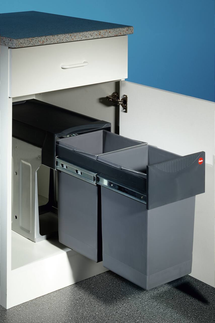Das Mülltrennsystem Tandem 7 lässt sich dank der schlanken Bauweise in verschiedenste Schränke fügen. Die minimale Einbaubreite liegt bei 300 mm, sodass es selbst in kleineren Drehtür-Unterschränken innerhalb der Küchenzeile Platz findet. Die Füllmenge von 30 Litern verteilt sich mit jeweils 15 Litern gleichmäßig auf die beiden zum Set gehörenden Behälter. Es werden damit die nötigen Voraussetzungen geschaffen, um recycelbare Wertstoffe und Restmüll ordentlich getrennt voneinander zu sammeln. Der auf dem Gestell fixierte Gesamtdeckel ist herausnehmbar und bietet sich als zusätzliche Ablage für Putzutensilien und Müllbeutel an. Das Mülltrennungssystem sitzt auf einem Vollauszug, der einen komfortablen Zugriff auf die Abfallsammler ermöglicht. Die Montage des Haushaltshelfers auf dem Schrankboden erfolgt unkompliziert.