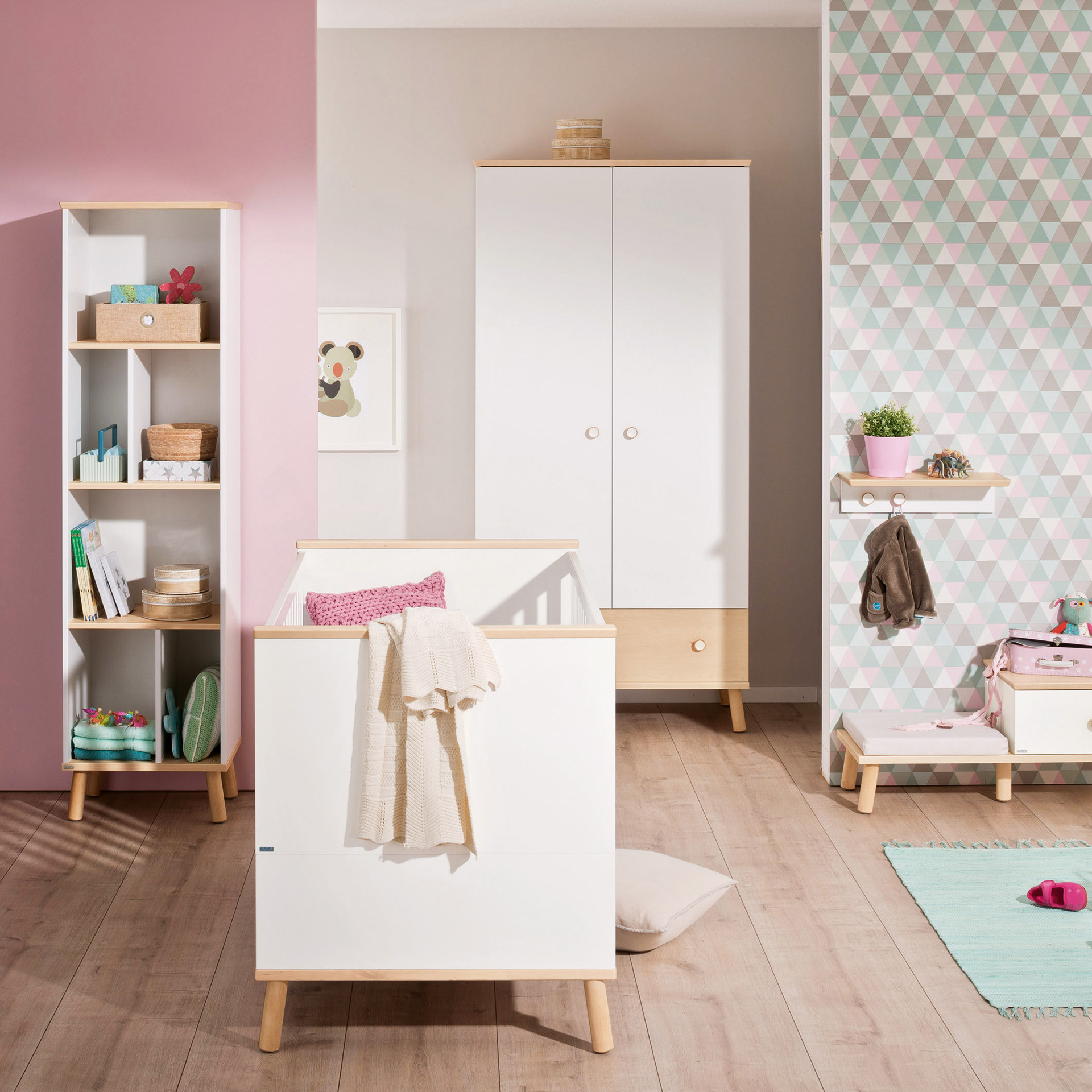 Harmonie im Kinderzimmer mit skandinavischem Birke-Naturlook. Hell mit Birke - Stimmungsaufheller Tag für Tag: Das natürliche und harmonische Ambiente im Kinderzimmer ist durch Flächen in Kreideweiß und Elemente in Birke-Optik geprägt. Klimaneutral hergestellt mit Holz aus nachhaltiger Forstwirtschaft und mit Lacken veredelt, die nach strenger Norm geprüft wurden. Spielbetten, Hochbetten, Etagenbetten - Je nach Höhe des Spielbetts (90, 120 und 160 cm) lässt sich der Raum darunter zum Spielen und Verstauen und beim Etagenbett (160 cm) auch zum Schlafen nutzen. Unters Hochbett (180 cm) passt sogar platzsparend ein Schreibtisch. Kojenbett mit Stauraum - Unters Kojenbett in den Maßen 90 x 200 cm oder 120 x 200 cm passt ein Unterschiebebett für Besuch über Nacht. Oder auch Rollregale und Rollboxen, die mit Sitzkissen als mobiler Platz dienen können. Das Unterschieberegal hat vier Fächer und kann von beiden Seiten unters Bett geschoben werden.