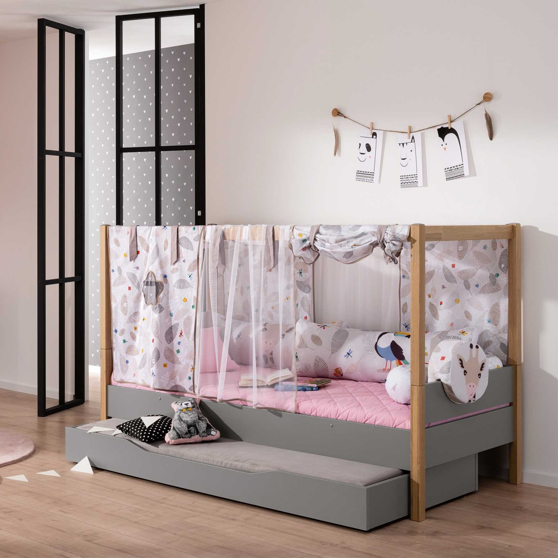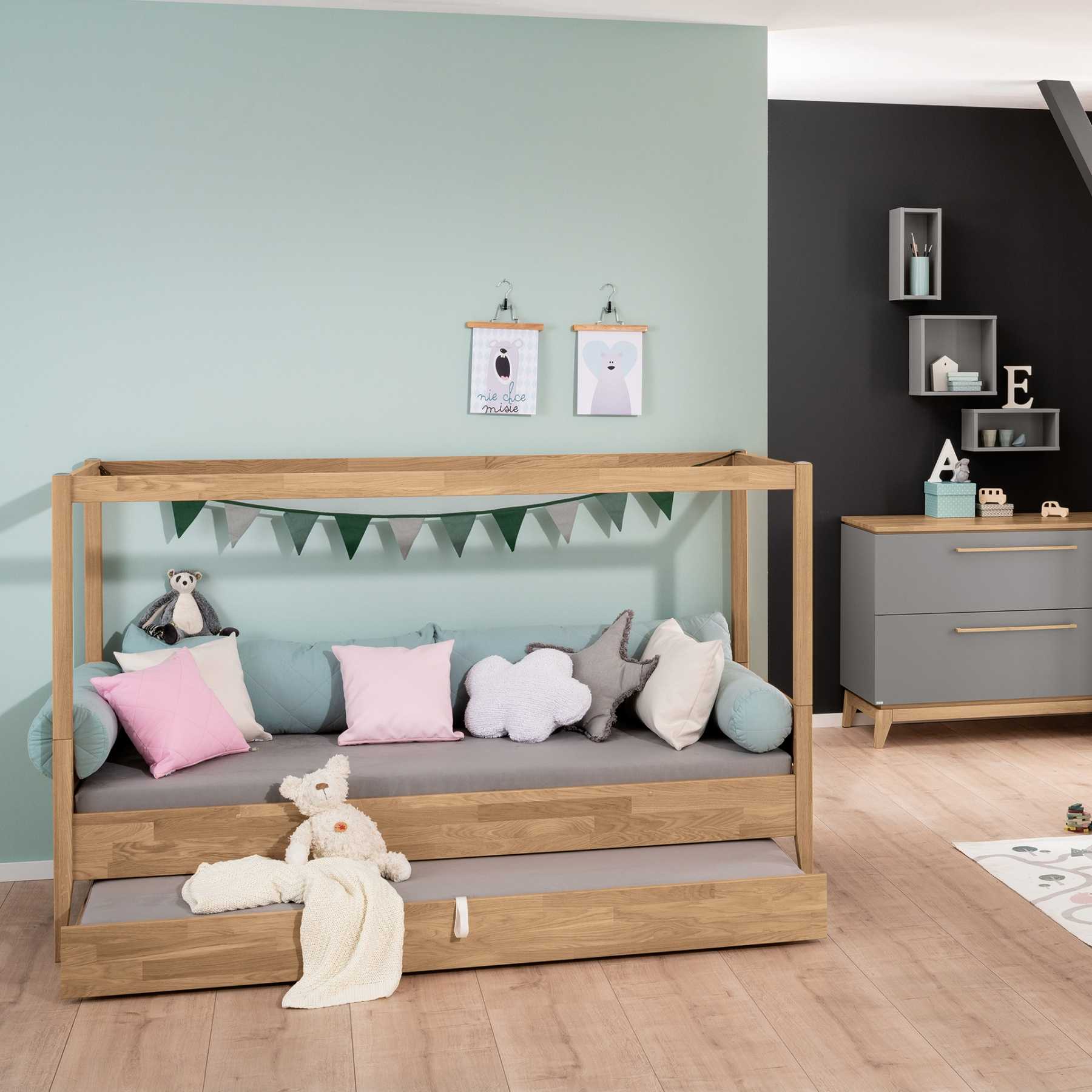 Trend im Kinderzimmer: hochwertige Möbel in nordisch inspiriertem Schiefergrau. Reizvolle Kontraste So sehen zeitgemäße Kinderzimmer aus: nordisches Design mit Liebe zum Detail und schönen Kontrasten in Schiefergrau und Eiche. Aus nachhaltiger Forstwirtschaft klimaneutral hergestellt. Spielbett, Hochbett, Etagenbett Ein Paradies für Mädchen und Jungs: Unterm Spielbett mit seiner Höhe von 120 oder 160 cm entsteht hinterm Vorhang-Set eine Abenteuerwelt. Unter das Hochbett mit 180 cm Höhe passt sogar ein Schreibtisch. Das Etagenbett bietet gleich zwei Schlafmöglichkeiten, mit Unterschiebebett sogar drei. Jugendbett in drei Breiten Richtig stylish wie für Erwachsene sieht die Traumliege in den Maßen 90, 120 und 140 x 200 cm mit ihren abgeschrägten Bettpfosten aus. Sie ist erhältlich in Schiefergrau kombiniert mit Eiche massiv oder komplett in Eiche massiv, mit oder ohne gepolstertem Betthaupt. So entstehen verschiedene Looks. Komfortable Schiebetürenschränke Die Schränke mit Schiebetüren sind in zwei Breiten erhältlich und bieten extra viel Platz. Das original PAIDI Slide System sorgt für höchste Sicherheit und schützt die Finger vorm Einklemmen. Die Türen schließen sanft und leise. Nordischer Wohlfühl-Look im Kinder- und Jugendzimmer.