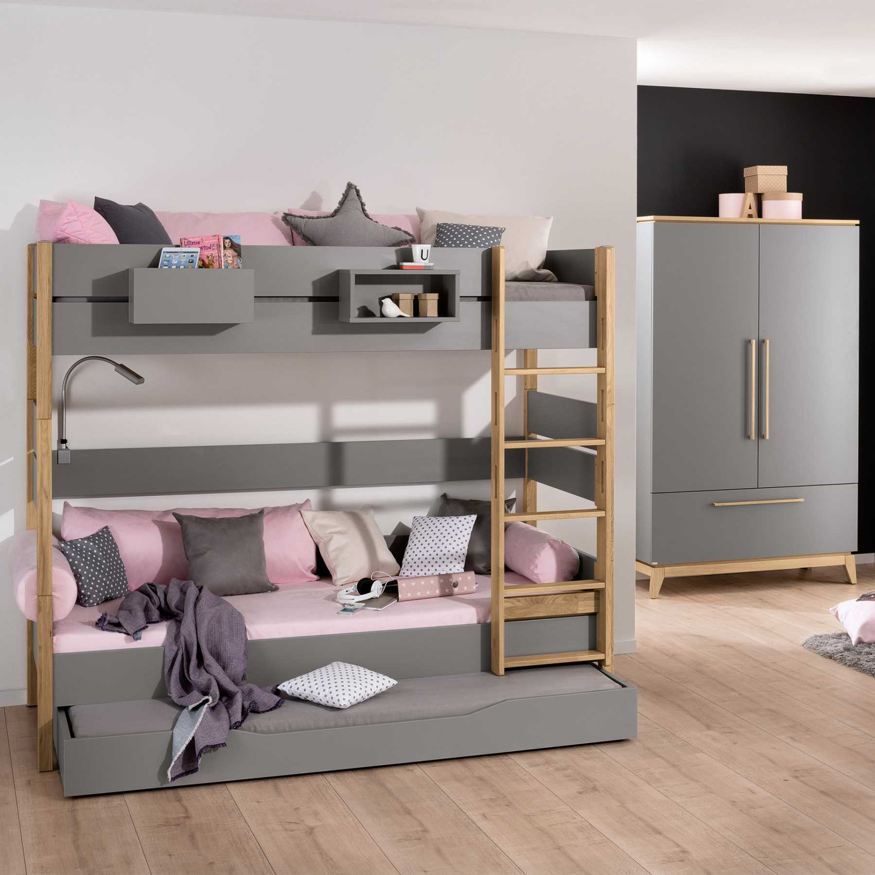 Trend im Kinderzimmer: hochwertige Möbel in nordisch inspiriertem Schiefergrau. Reizvolle Kontraste So sehen zeitgemäße Kinderzimmer aus: nordisches Design mit Liebe zum Detail und schönen Kontrasten in Schiefergrau und Eiche. Aus nachhaltiger Forstwirtschaft klimaneutral hergestellt. Spielbett, Hochbett, Etagenbett Ein Paradies für Mädchen und Jungs: Unterm Spielbett mit seiner Höhe von 120 oder 160 cm entsteht hinterm Vorhang-Set eine Abenteuerwelt. Unter das Hochbett mit 180 cm Höhe passt sogar ein Schreibtisch. Das Etagenbett bietet gleich zwei Schlafmöglichkeiten, mit Unterschiebebett sogar drei. Jugendbett in drei Breiten Richtig stylish wie für Erwachsene sieht die Traumliege in den Maßen 90, 120 und 140 x 200 cm mit ihren abgeschrägten Bettpfosten aus. Sie ist erhältlich in Schiefergrau kombiniert mit Eiche massiv oder komplett in Eiche massiv, mit oder ohne gepolstertem Betthaupt. So entstehen verschiedene Looks. Komfortable Schiebetürenschränke Die Schränke mit Schiebetüren sind in zwei Breiten erhältlich und bieten extra viel Platz. Das original PAIDI Slide System sorgt für höchste Sicherheit und schützt die Finger vorm Einklemmen. Die Türen schließen sanft und leise. Nordischer Wohlfühl-Look im Kinder- und Jugendzimmer.