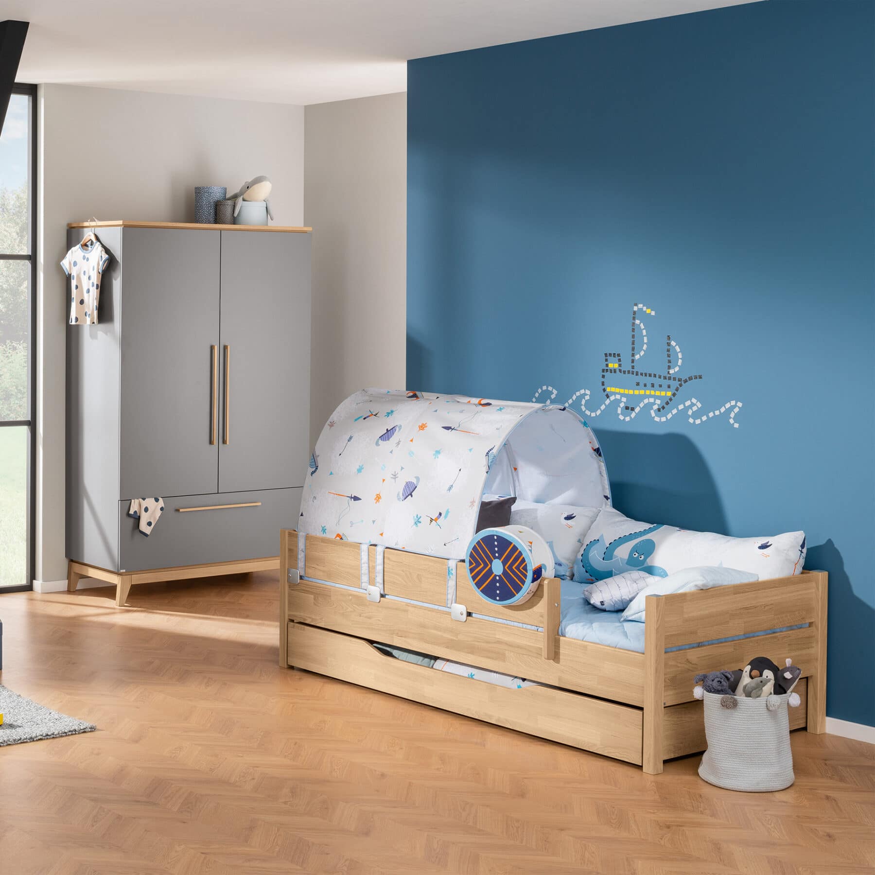Trend im Kinderzimmer: hochwertige Möbel in nordisch inspiriertem Schiefergrau. Reizvolle Kontraste So sehen zeitgemäße Kinderzimmer aus: nordisches Design mit Liebe zum Detail und schönen Kontrasten in Schiefergrau und Eiche. Aus nachhaltiger Forstwirtschaft klimaneutral hergestellt. Spielbett, Hochbett, Etagenbett Ein Paradies für Mädchen und Jungs: Unterm Spielbett mit seiner Höhe von 120 oder 160 cm entsteht hinterm Vorhang-Set eine Abenteuerwelt. Unter das Hochbett mit 180 cm Höhe passt sogar ein Schreibtisch. Das Etagenbett bietet gleich zwei Schlafmöglichkeiten, mit Unterschiebebett sogar drei. Jugendbett in drei Breiten Richtig stylish wie für Erwachsene sieht die Traumliege in den Maßen 90, 120 und 140 x 200 cm mit ihren abgeschrägten Bettpfosten aus. Sie ist erhältlich in Schiefergrau kombiniert mit Eiche massiv oder komplett in Eiche massiv, mit oder ohne gepolstertem Betthaupt. So entstehen verschiedene Looks. Komfortable Schiebetürenschränke Die Schränke mit Schiebetüren sind in zwei Breiten erhältlich und bieten extra viel Platz. Das original PAIDI Slide System sorgt für höchste Sicherheit und schützt die Finger vorm Einklemmen. Die Türen schließen sanft und leise. Nordischer Wohlfühl-Look im Kinder- und Jugendzimmer.