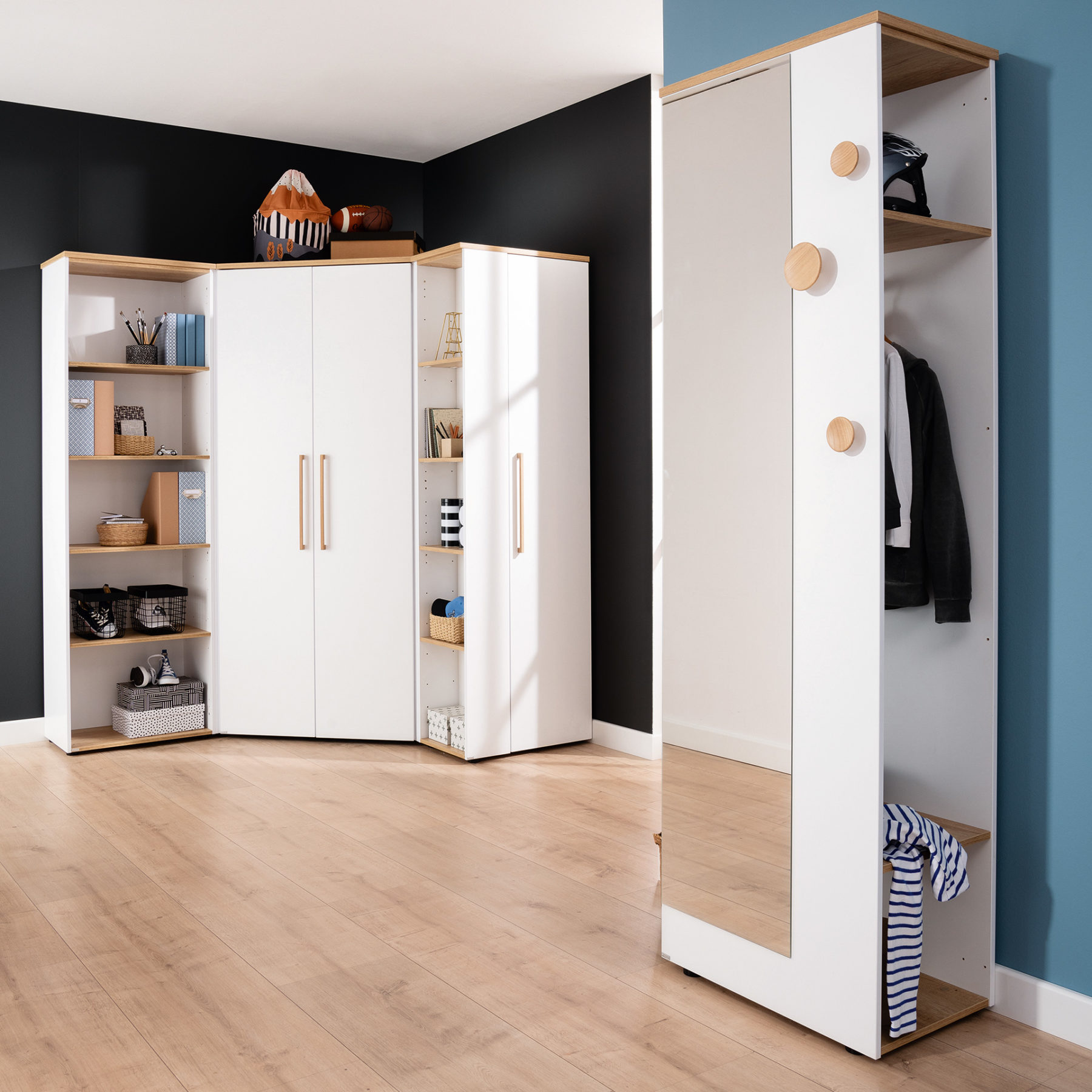 - Kann an die schmale oder breite Seite vom Eck-Kleiderschrank Oscar 2T angestellt oder frei aufgestellt werden