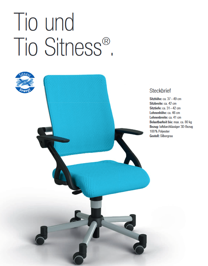 Modell:Tio, Tio Sitness und Yvo Beschreibung : Ersatzbezug für Kinder- und Jugendstuhl Tio, Tio Sitness und Yvo luftdurchlässiger 3D Bezug 100 % Polyester, waschbar bei 30 °Lieferbar in verschiedenen Ausführungen Hinweis :Weiteres Zubehör gehört jedoch nicht zum Lieferumfang, ist aber selbstverständlich gegen Mehrpreis erhältlich. Wir bitten um Beachtung!  ______________________________________________________________________________________________________________________PAIDI Tio, Tio Sitness, Yvo Lernen leicht gemacht. Mit ergonomischen Kinderschreibtischen von PAIDI. Schüler wachsen nicht nur mit ihren Aufgaben. Von der ersten Klasse bis zum Abschluss ist ein weiter Weg – und Kinderschreibtische von PAIDI wachsen immer mit. Eine stets ergonomische Sitzposition wird dadurch erreicht, dass unsere Kinderschreibtische höhenverstellbar sind. Auch dank der neigbaren Arbeitsplatte werden Rückenbeschwerden und Haltungsschäden vermieden. Passen dazu: ergonomische Kinderschreibtischstühle Weil ein Tisch ohne Stuhl wenig Sinn ergibt, gibt es bei PAIDI natürlich auch eine große Auswahl an Kinderschreibtischstühlen. Alle Schreibtischstühle sind ergonomisch und mitwachsend, weil sich Sitzhöhe, Sitztiefe und Rückenlehne ganz leicht anpassen lassen. Bei unserem Tio Sitness® sorgt die Sitness®-Technologie dafür, dass die Schüler sogar beim Sitzen in Bewegung bleiben.