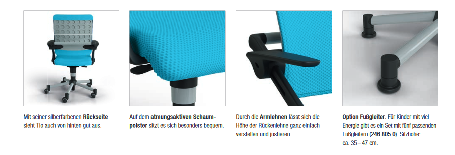 Modell:Tio Black Ausstattung / Beschreibung :  Lastabhängig gebremste Sicherheitsdoppelrollen für weiche und harte Böden.Stufenlose Sitzhöheneinstellung dank speziell auf Kinder abgestimmter GasdruckfederSitztiefe und Rückenlehne durch stufenlos arretierbare Positionierung der Armlehnen einstellbar - für eine optimale Relation von Sitzhöhe und Sitztiefe, angelehnt an die DIN EN 1335Atmungsaktives SchaumpolsterLuftdurchlässige 3 D Bezüge, abnehmbar und bei 30 ° waschbar Belastbarkeit bis 50.0000 Scheuertouren/MartindaleLichtechtheit 6 ( entspricht sehr gut )Gestell SchwarzBelastbarkeit bis maximal 80 Kilo Bezug 100 % Polyester Lieferbar in verschiedenen Ausführungen Sitzhöhe ca. 37-49 cm Sitzbreite ca. 42 cm Sitztiefe ca. 31-42 cm Lehnenhöhe ca. 46 cm Lehnenbreite ca. 41 cm Hinweis :Bei empfindlichen Bodenbelägen ( zum Beispiel Parkett, Kork, Laminat ) empfiehlt die Firma Paidi den Einsatz einer Bodenschutzmatte. Im Falle der Nichtbeachtung kann dafür keine Haftung für evtl. entstandene Schäden übernommen werden. Das Modell Tio ist auch mit Gestell in Silbergrau als Tio oder in der Ausführung Tio Sitness ( Sitzfläche lässt sich bei Tio Sitness in alle Richtungen neigen ) lieferbar. Weiteres Zubehör gehört jedoch nicht zum Lieferumfang, ist aber selbstverständlich gegen Mehrpreis erhältlich. Wir bitten um Beachtung!  ______________________________________________________________________________________________________________________PAIDI Tio BlackLernen leicht gemacht. Mit ergonomischen Kinderschreibtischen von PAIDI. Schüler wachsen nicht nur mit ihren Aufgaben. Von der ersten Klasse bis zum Abschluss ist ein weiter Weg – und Kinderschreibtische von PAIDI wachsen immer mit. Eine stets ergonomische Sitzposition wird dadurch erreicht, dass unsere Kinderschreibtische höhenverstellbar sind. Auch dank der neigbaren Arbeitsplatte werden Rückenbeschwerden und Haltungsschäden vermieden. Passen dazu: ergonomische Kinderschreibtischstühle Weil ein Tisch ohne Stuhl wenig Sinn ergibt, gibt es bei PAIDI natürlich auch eine große Auswahl an Kinderschreibtischstühlen. Alle Schreibtischstühle sind ergonomisch und mitwachsend, weil sich Sitzhöhe, Sitztiefe und Rückenlehne ganz leicht anpassen lassen. Bei unserem Tio Sitness® sorgt die Sitness®-Technologie dafür, dass die Schüler sogar beim Sitzen in Bewegung bleiben.