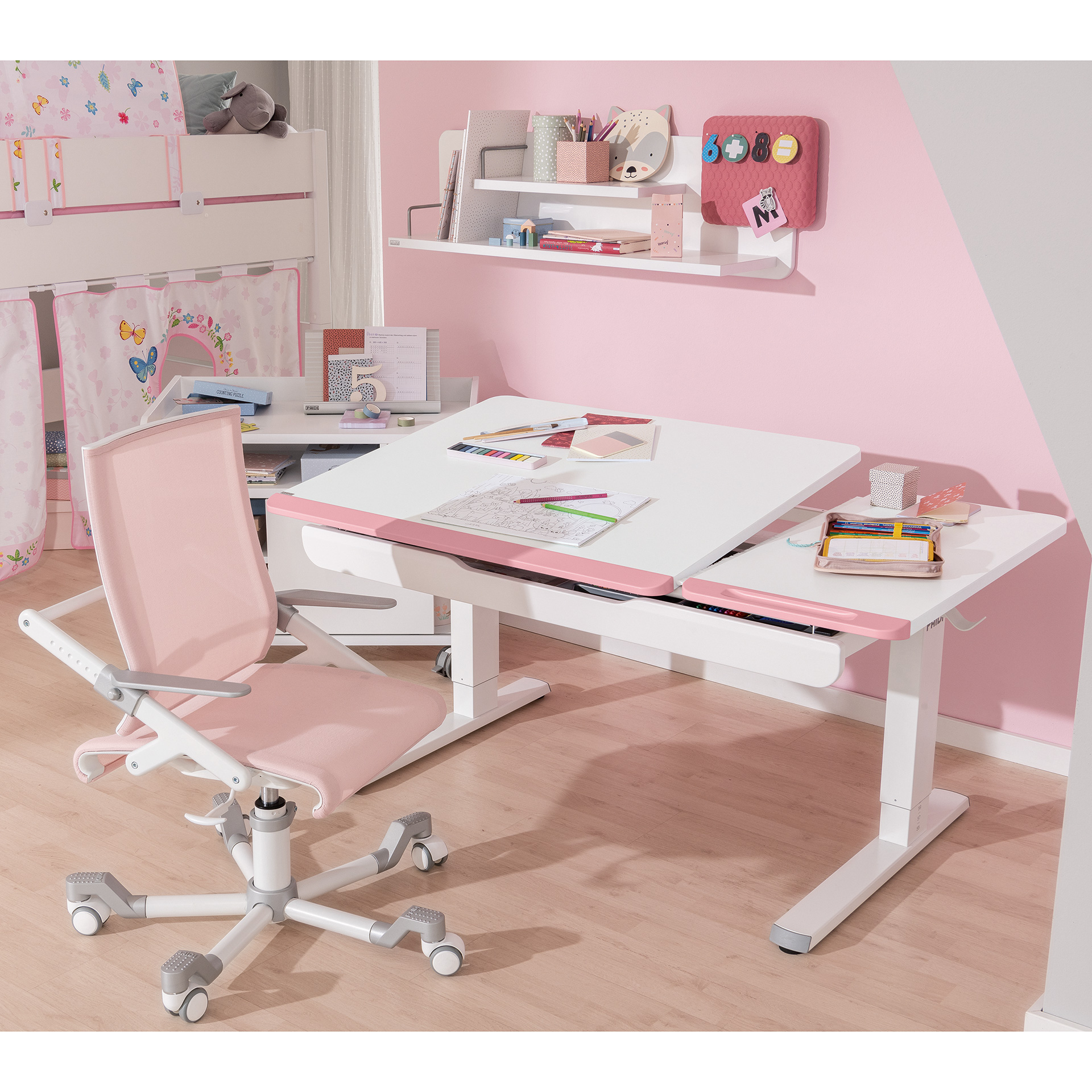 Lernen leicht gemacht. Mit ergonomischen Kinderschreibtischen von PAIDI. Schüler wachsen nicht nur mit ihren Aufgaben. Von der ersten Klasse bis zum Abschluss ist ein weiter Weg – und Kinderschreibtische von PAIDI wachsen immer mit. Eine stets ergonomische Sitzposition wird dadurch erreicht, dass unsere Kinderschreibtische höhenverstellbar sind. Auch dank der neigbaren Arbeitsplatte werden Rückenbeschwerden und Haltungsschäden vermieden. Passen dazu: ergonomische Kinderschreibtischstühle Weil ein Tisch ohne Stuhl wenig Sinn ergibt, gibt es bei PAIDI natürlich auch eine große Auswahl an Kinderschreibtischstühlen. Alle Schreibtischstühle sind ergonomisch und mitwachsend, weil sich Sitzhöhe, Sitztiefe und Rückenlehne ganz leicht anpassen lassen. Bei unserem Tio Sitness® sorgt die Sitness®-Technologie dafür, dass die Schüler sogar beim Sitzen in Bewegung bleiben.