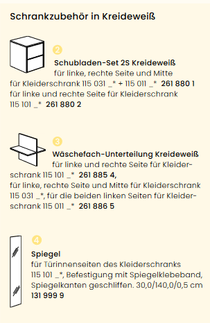 | Schrankausführung: | Drehtürenschrank ohne Spiegel , Drehtürenschrank mit Schubkasten und Tür |