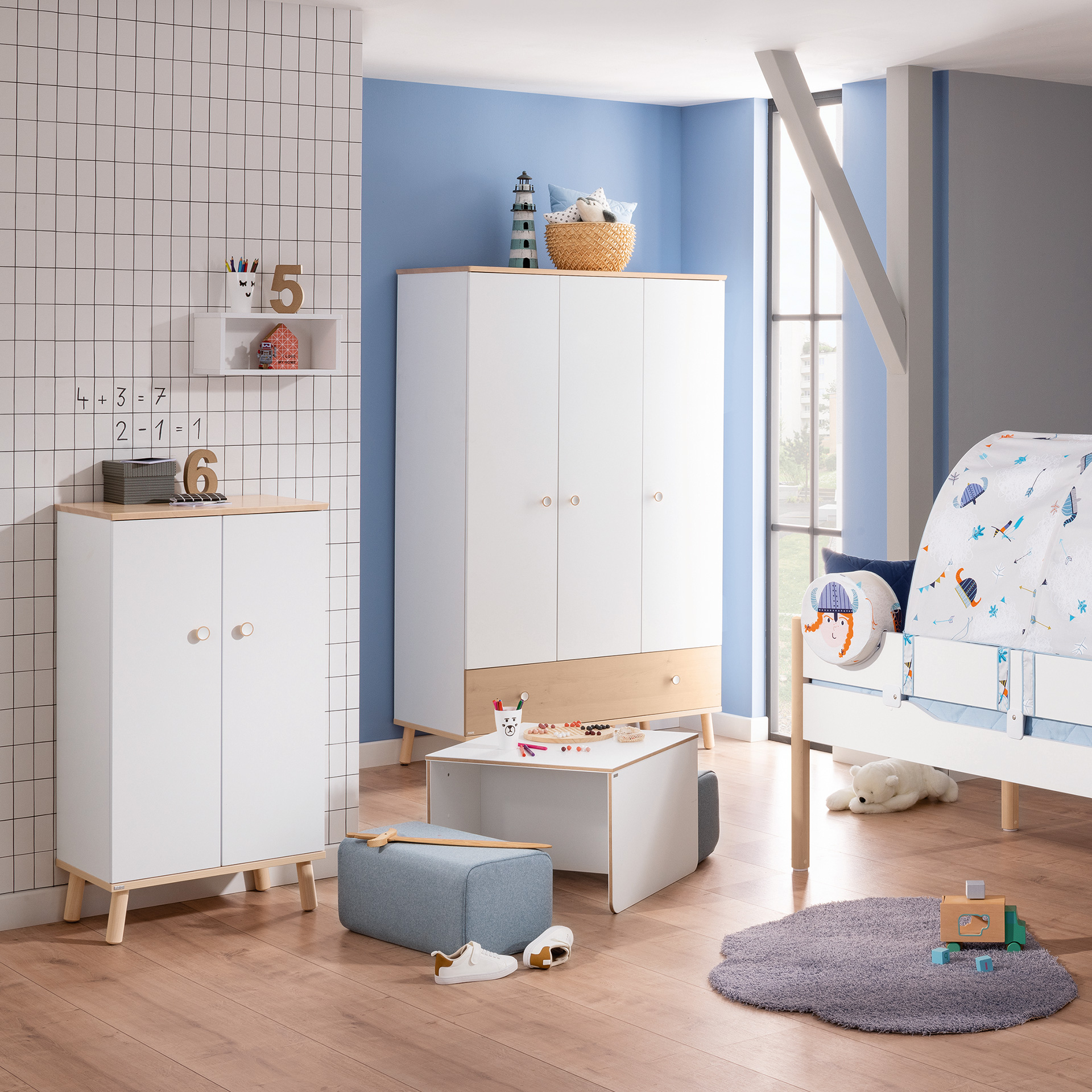 Harmonie im Kinderzimmer mit skandinavischem Birke-Naturlook. Hell mit Birke - Stimmungsaufheller Tag für Tag: Das natürliche und harmonische Ambiente im Kinderzimmer ist durch Flächen in Kreideweiß und Elemente in Birke-Optik geprägt. Klimaneutral hergestellt mit Holz aus nachhaltiger Forstwirtschaft und mit Lacken veredelt, die nach strenger Norm geprüft wurden. Spielbetten, Hochbetten, Etagenbetten - Je nach Höhe des Spielbetts (90, 120 und 160 cm) lässt sich der Raum darunter zum Spielen und Verstauen und beim Etagenbett (160 cm) auch zum Schlafen nutzen. Unters Hochbett (180 cm) passt sogar platzsparend ein Schreibtisch. Kojenbett mit Stauraum - Unters Kojenbett in den Maßen 90 x 200 cm oder 120 x 200 cm passt ein Unterschiebebett für Besuch über Nacht. Oder auch Rollregale und Rollboxen, die mit Sitzkissen als mobiler Platz dienen können. Das Unterschieberegal hat vier Fächer und kann von beiden Seiten unters Bett geschoben werden.
