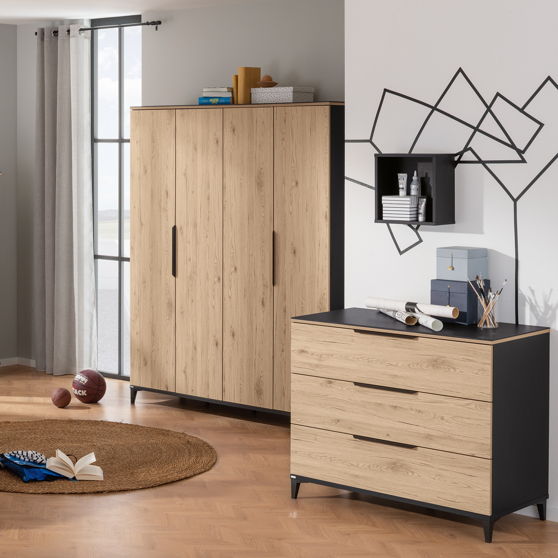 Industrial Style. Starke Kontraste fürs Kinderzimmer Tomke zeichnet sich durch das Zusammenspiel zweier Farbtöne aus: Schwarze Korpusse rahmen die Fronten aus warmem Holzdekor ein und verleihen den Möbeln einen urbanen Look. Die holzfarbenen Einlegeböden scheinen in den schwarzen Regalen zu schweben und setzen Schönes sowie Nützliches in Szene. So gestaltest du ein zeitloses Babyzimmer, das später auch als Grundlage für ein Kinder- oder Jugendzimmer funktioniert. Babybett Tomke – innovativ und komfortabel. Unsere Babybetten sind mit dem patentierten PAIDI-Schlupfsprossenmechanismus ausgestattet. Damit lassen sich die Gitterstäbe leicht herausnehmen und genauso komfortabel wieder einsetzen.