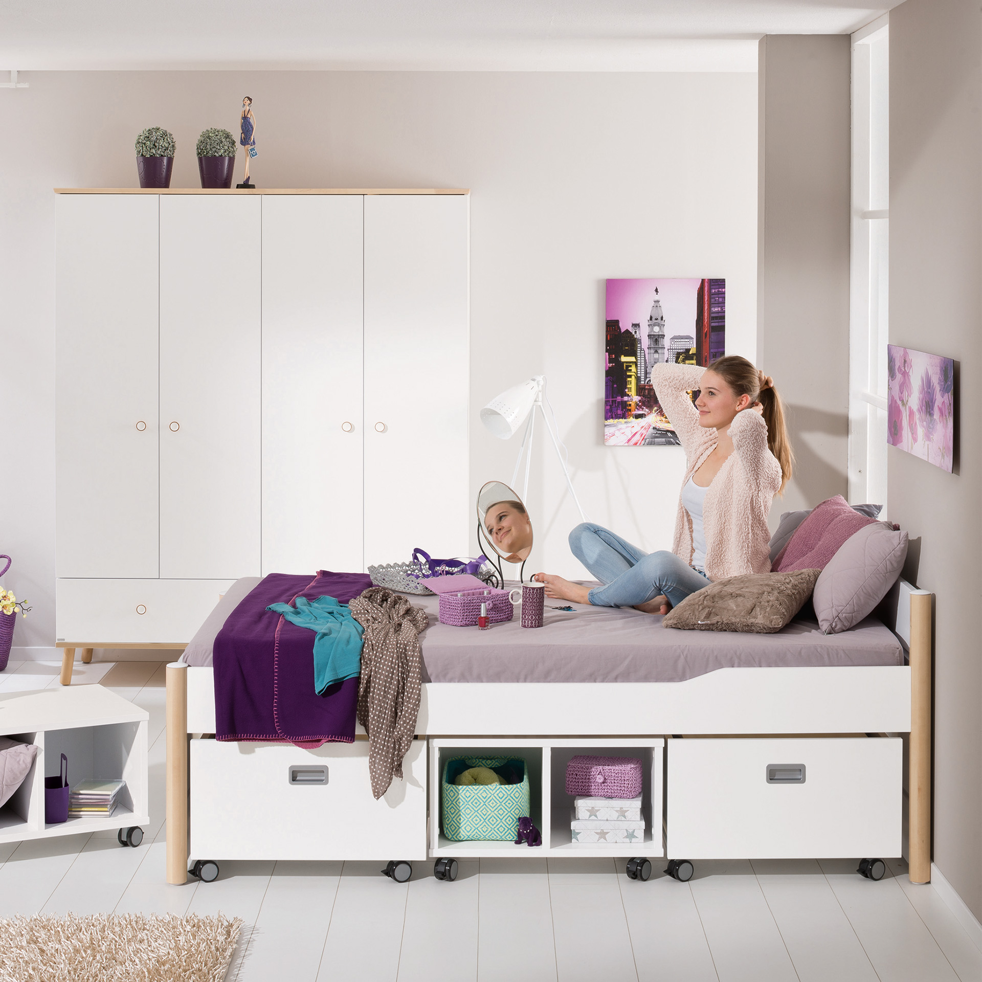 Harmonie im Kinderzimmer mit skandinavischem Birke-Naturlook. Hell mit Birke - Stimmungsaufheller Tag für Tag: Das natürliche und harmonische Ambiente im Kinderzimmer ist durch Flächen in Kreideweiß und Elemente in Birke-Optik geprägt. Klimaneutral hergestellt mit Holz aus nachhaltiger Forstwirtschaft und mit Lacken veredelt, die nach strenger Norm geprüft wurden. Spielbetten, Hochbetten, Etagenbetten - Je nach Höhe des Spielbetts (90, 120 und 160 cm) lässt sich der Raum darunter zum Spielen und Verstauen und beim Etagenbett (160 cm) auch zum Schlafen nutzen. Unters Hochbett (180 cm) passt sogar platzsparend ein Schreibtisch. Kojenbett mit Stauraum - Unters Kojenbett in den Maßen 90 x 200 cm oder 120 x 200 cm passt ein Unterschiebebett für Besuch über Nacht. Oder auch Rollregale und Rollboxen, die mit Sitzkissen als mobiler Platz dienen können. Das Unterschieberegal hat vier Fächer und kann von beiden Seiten unters Bett geschoben werden.