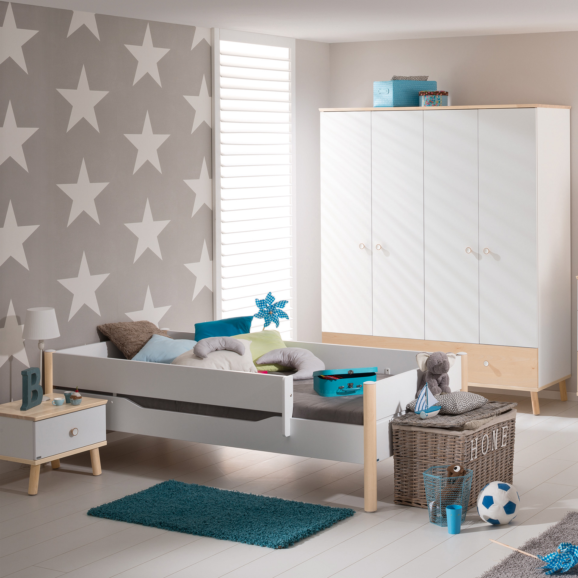 Harmonie im Kinderzimmer mit skandinavischem Birke-Naturlook. Hell mit Birke - Stimmungsaufheller Tag für Tag: Das natürliche und harmonische Ambiente im Kinderzimmer ist durch Flächen in Kreideweiß und Elemente in Birke-Optik geprägt. Klimaneutral hergestellt mit Holz aus nachhaltiger Forstwirtschaft und mit Lacken veredelt, die nach strenger Norm geprüft wurden. Spielbetten, Hochbetten, Etagenbetten - Je nach Höhe des Spielbetts (90, 120 und 160 cm) lässt sich der Raum darunter zum Spielen und Verstauen und beim Etagenbett (160 cm) auch zum Schlafen nutzen. Unters Hochbett (180 cm) passt sogar platzsparend ein Schreibtisch. Kojenbett mit Stauraum - Unters Kojenbett in den Maßen 90 x 200 cm oder 120 x 200 cm passt ein Unterschiebebett für Besuch über Nacht. Oder auch Rollregale und Rollboxen, die mit Sitzkissen als mobiler Platz dienen können. Das Unterschieberegal hat vier Fächer und kann von beiden Seiten unters Bett geschoben werden.