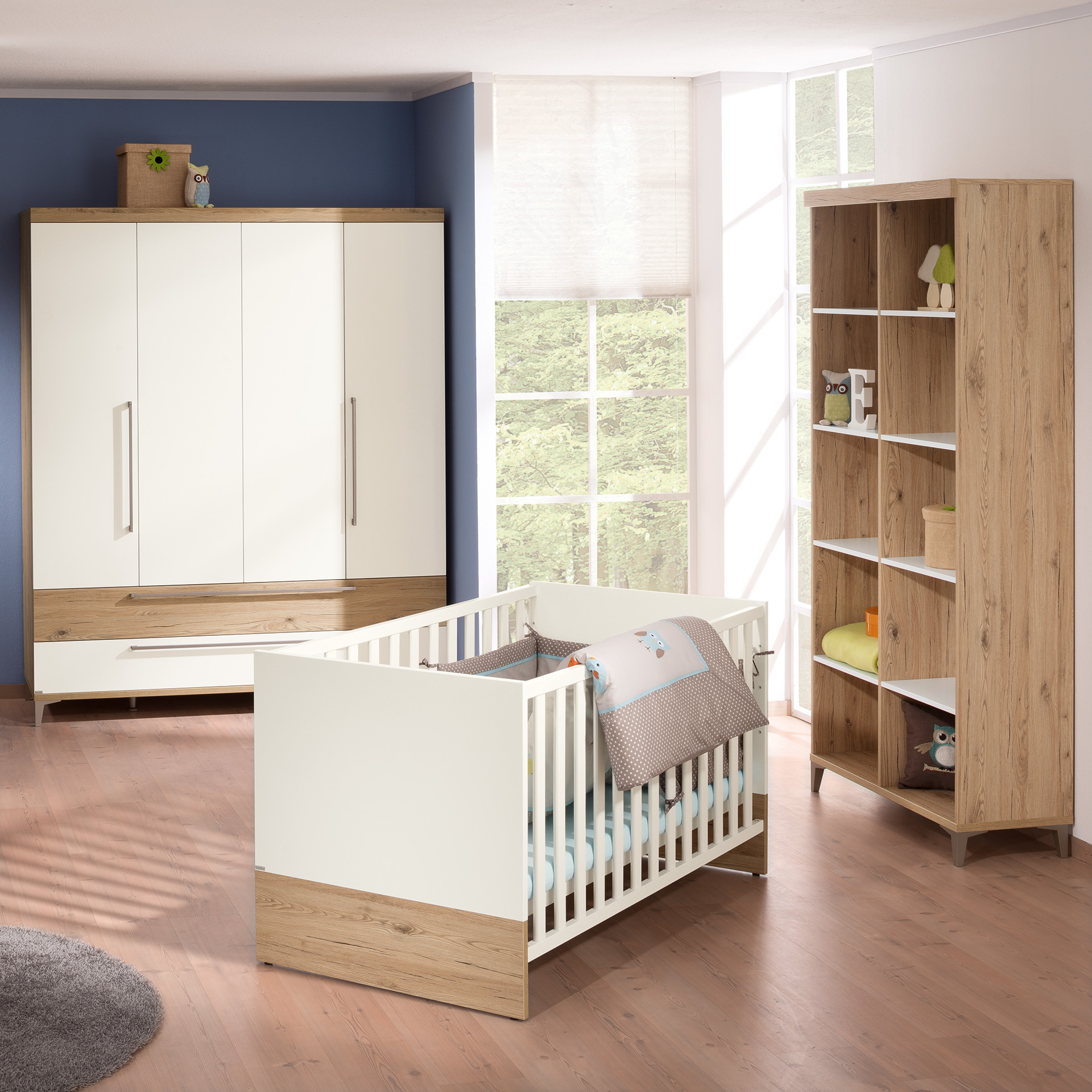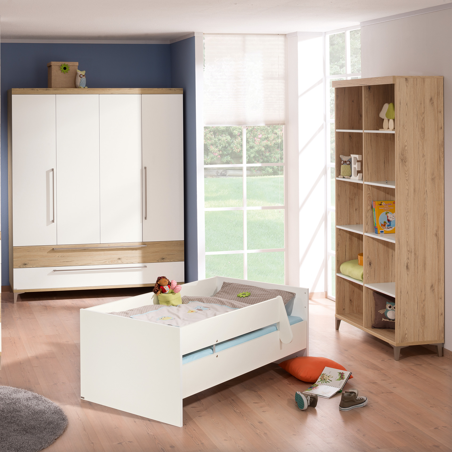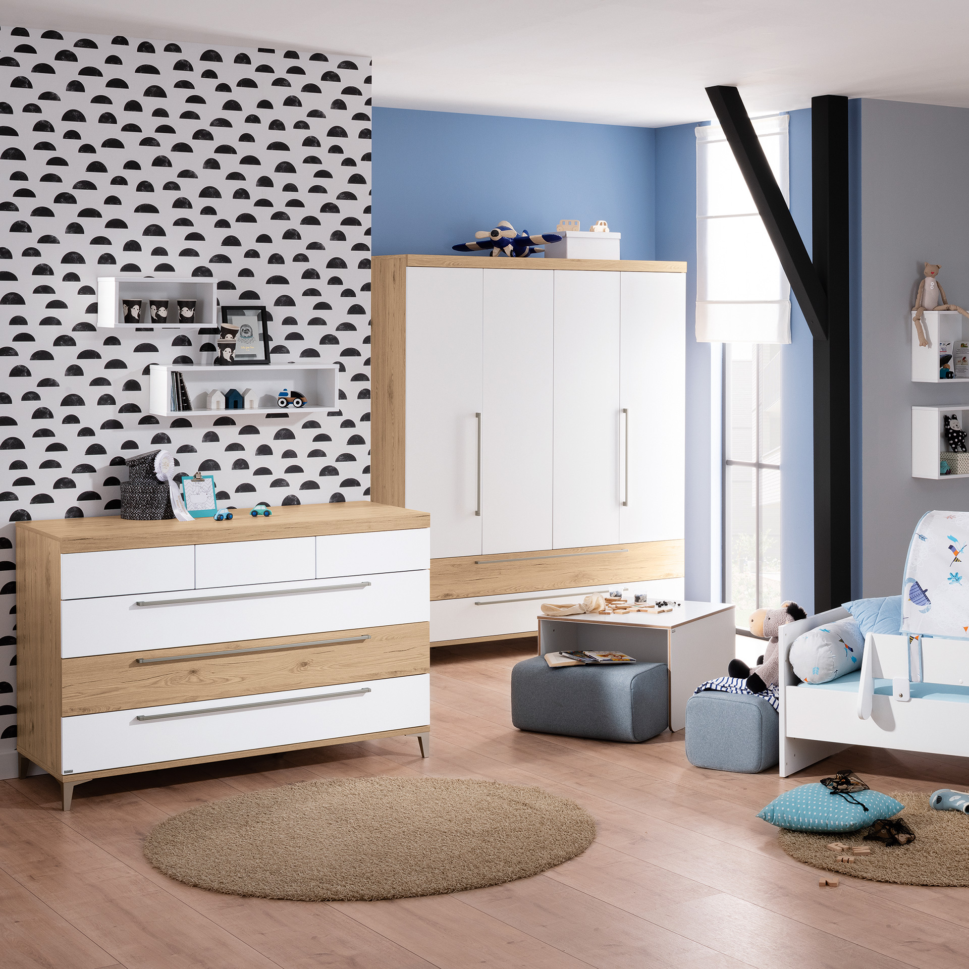 Durchdacht bis ins Detail. Kontraste in Holzoptik - Die gepaarte Eleganz von natürlichem Holzlook und strahlendem Weiß verleiht Remo eine zeitlose Modernität. Der stilvolle Kontrast trifft auf pure Funktion. Die Schiebetüren bremsen sanft für Kinderhände und schließen leise von selbst. Push-to-open Funktion und Vollauszug ermöglichen einen schnellen und einfachen Zugang zu den wichtigsten Utensilien. Ein Bett, viele Umbaumöglichkeiten - Wird dein Kind zu groß fürs Babybett, kann dieses mit dem Sicherheits-Set in die Juniorstufe verwandelt werden. Lasse dich von unseren Ergänzungen inspirieren: Mit einer Leiter kann dein Kind im Nu allein aus dem Bett klettern, das Spielzelt sorgt für einen kleinen gemütlichen Rückzugsort.