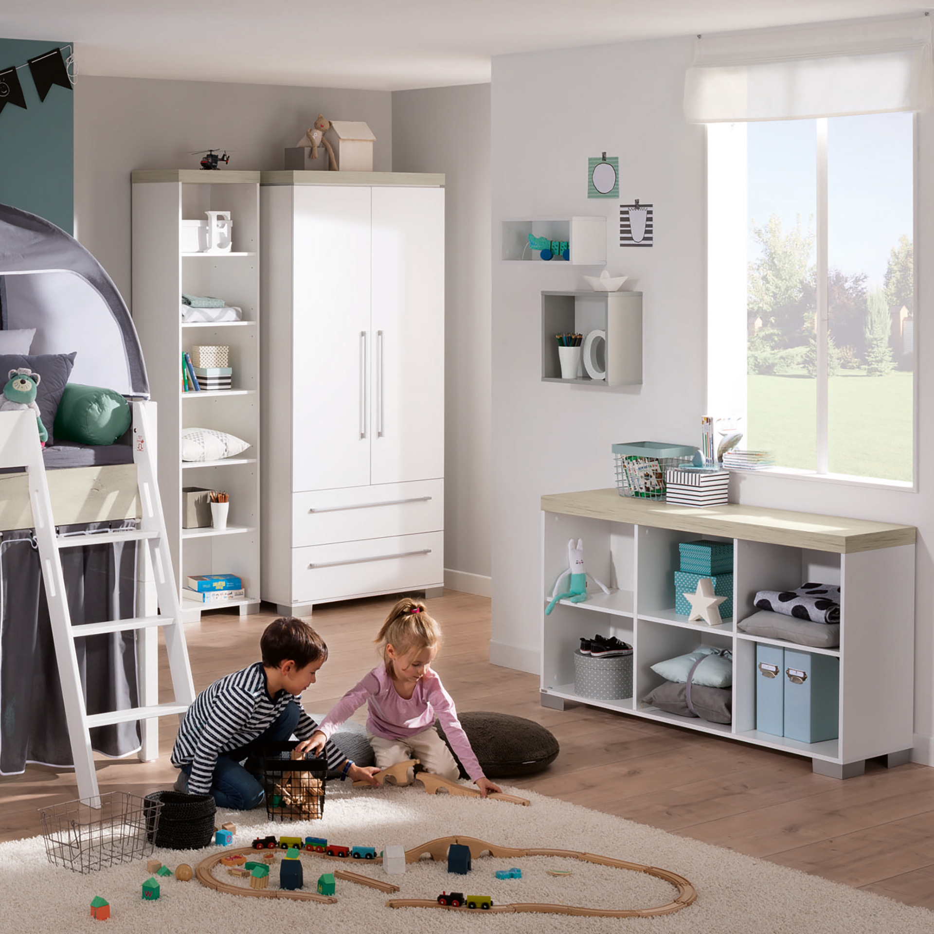 Die Möbelserie Kira des Kindermöbel-Produzenten Paidi beinhaltet Möbel für Babyzimmer, Kinderzimmer und Jugendzimmer. Die Deckplatten bei den Beimöbeln und Kleiderschränken sind abgesetzt und scheinen zu schweben. Das sorgt für eine leichte Optik. Außerdem hebt sich die Deckplatte auch farblich ab. Den Farbakzent können Sie in natürlich wirkender Nebraska-Eiche oder im Vintage-Style der Eiche-Nautik wählen. Der Korpus der einzelnen Möbelstücke ist in schönem Kreideweiß gehalten. Die metallenen Standfüße harmonieren mit den länglich gestalteten Griffen. Insgesamt ist das Design sehr linear und orientiert sich an Möbeln für Erwachsene. Die zurückhaltende Farbgebung lässt viel Raum für eigene Gestaltungs-Ideen.