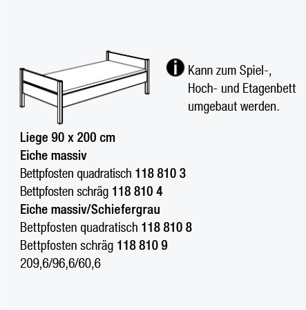 • bei Betten ( je nach Type ) Bettpfosten Eiche massiv / Bettseiten Eiche massiv oder Schiefergrau
