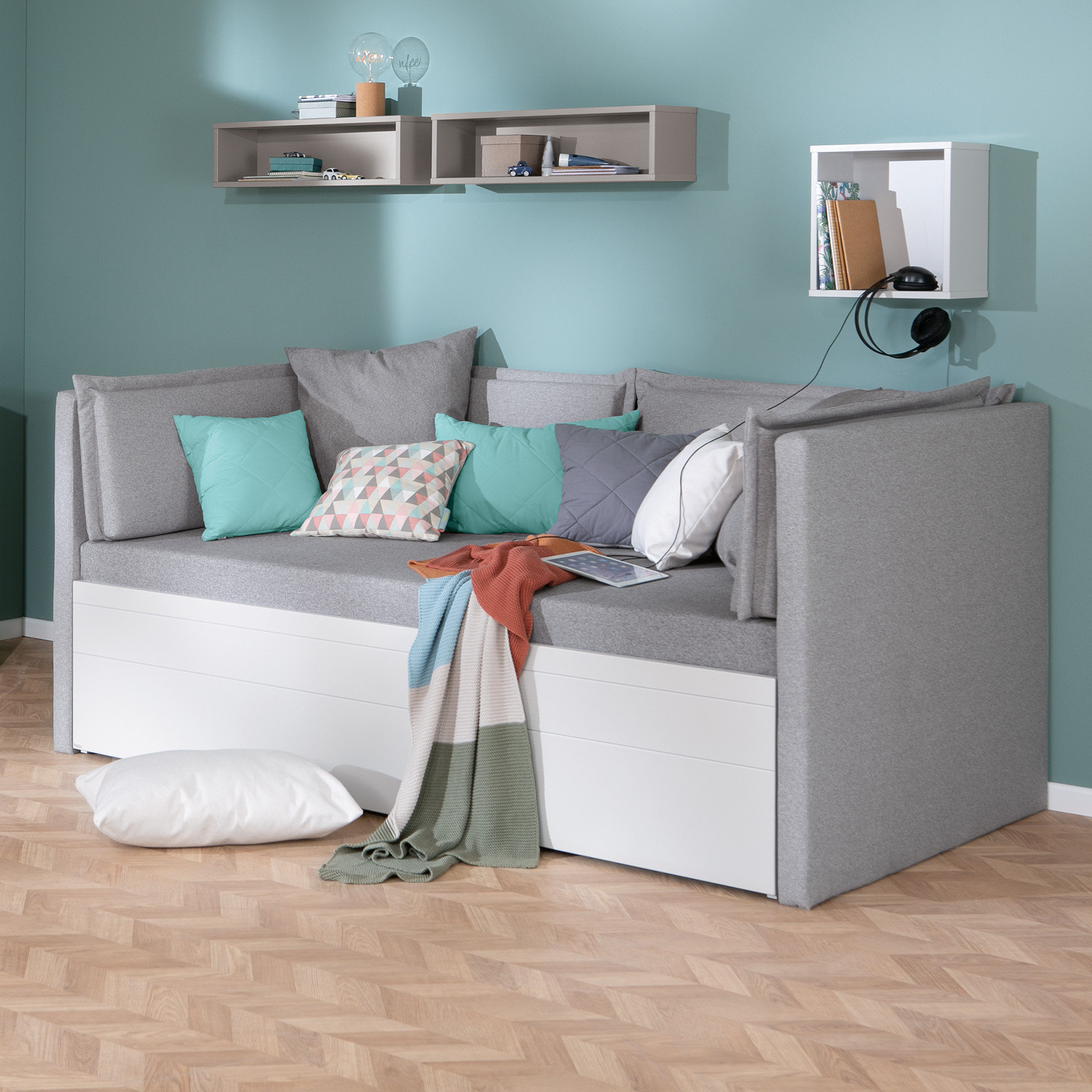 Universalliege Flynn - Flexible Lösung fürs Kinderzimmer und Jugendzimmer: Die Universalliege, die nicht nur Liege, sondern auch Sofa und Doppelbett sein kann. Sofa, das wenig Platz braucht. Als einfache Liege oder mit Kissen und Rückenrollen als Sofa braucht Flynn nur einen Platz von 200 x 100 cm. Weil die Universalliege ein niedriges Haupt hat, passt sie auch gut unter Dachschrägen. Mit einem einfachen Handgriff kann man die Liege hervorziehen und hochklappen. Die gleiche Höhe macht Flynn zu einem komfortablen Doppelbett mit einer Liegefläche von 200 x 198,5 cm.