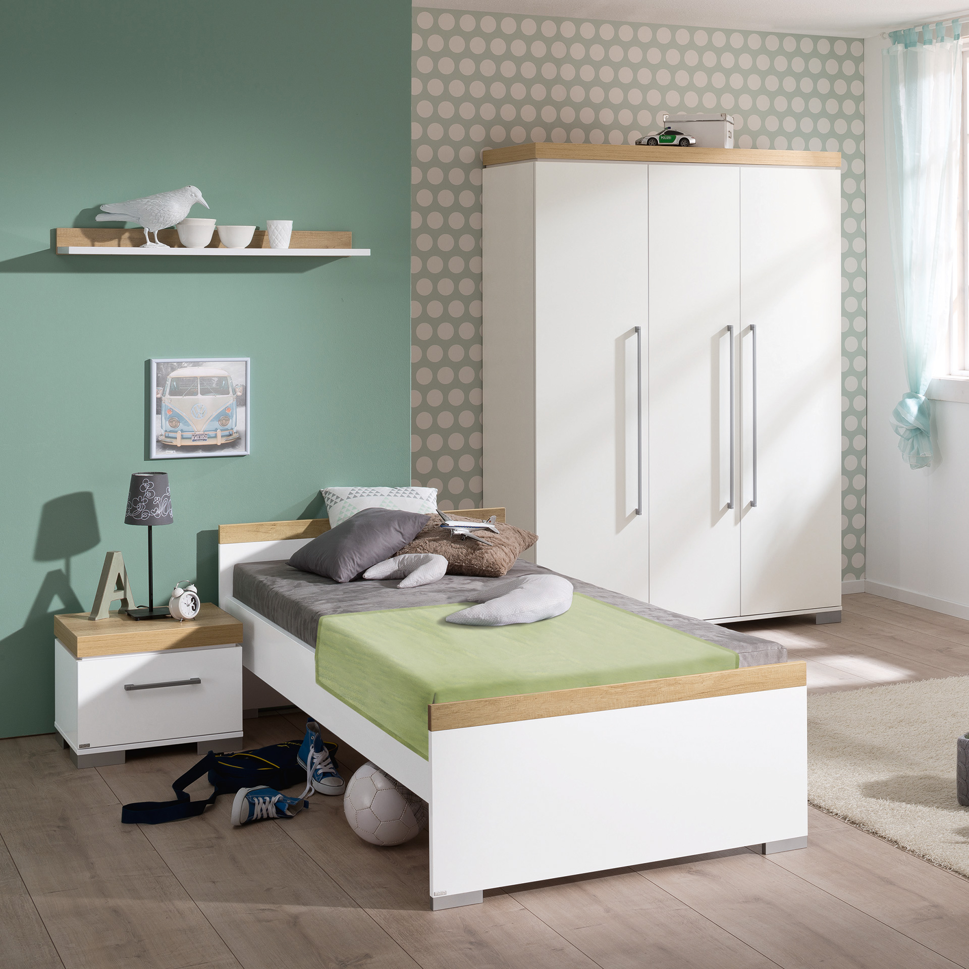 Die Möbelserie Kira des Kindermöbel-Produzenten Paidi beinhaltet Möbel für Babyzimmer, Kinderzimmer und Jugendzimmer. Die Deckplatten bei den Beimöbeln und Kleiderschränken sind abgesetzt und scheinen zu schweben. Das sorgt für eine leichte Optik. Außerdem hebt sich die Deckplatte auch farblich ab. Den Farbakzent können Sie in natürlich wirkender Nebraska-Eiche oder im Vintage-Style der Eiche-Nautik wählen. Der Korpus der einzelnen Möbelstücke ist in schönem Kreideweiß gehalten. Die metallenen Standfüße harmonieren mit den länglich gestalteten Griffen. Insgesamt ist das Design sehr linear und orientiert sich an Möbeln für Erwachsene. Die zurückhaltende Farbgebung lässt viel Raum für eigene Gestaltungs-Ideen.