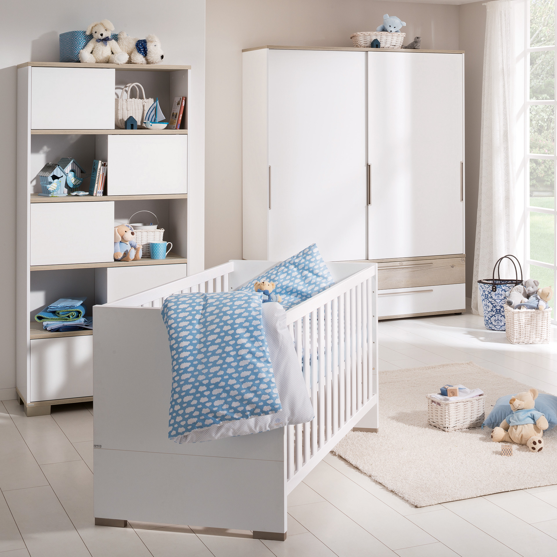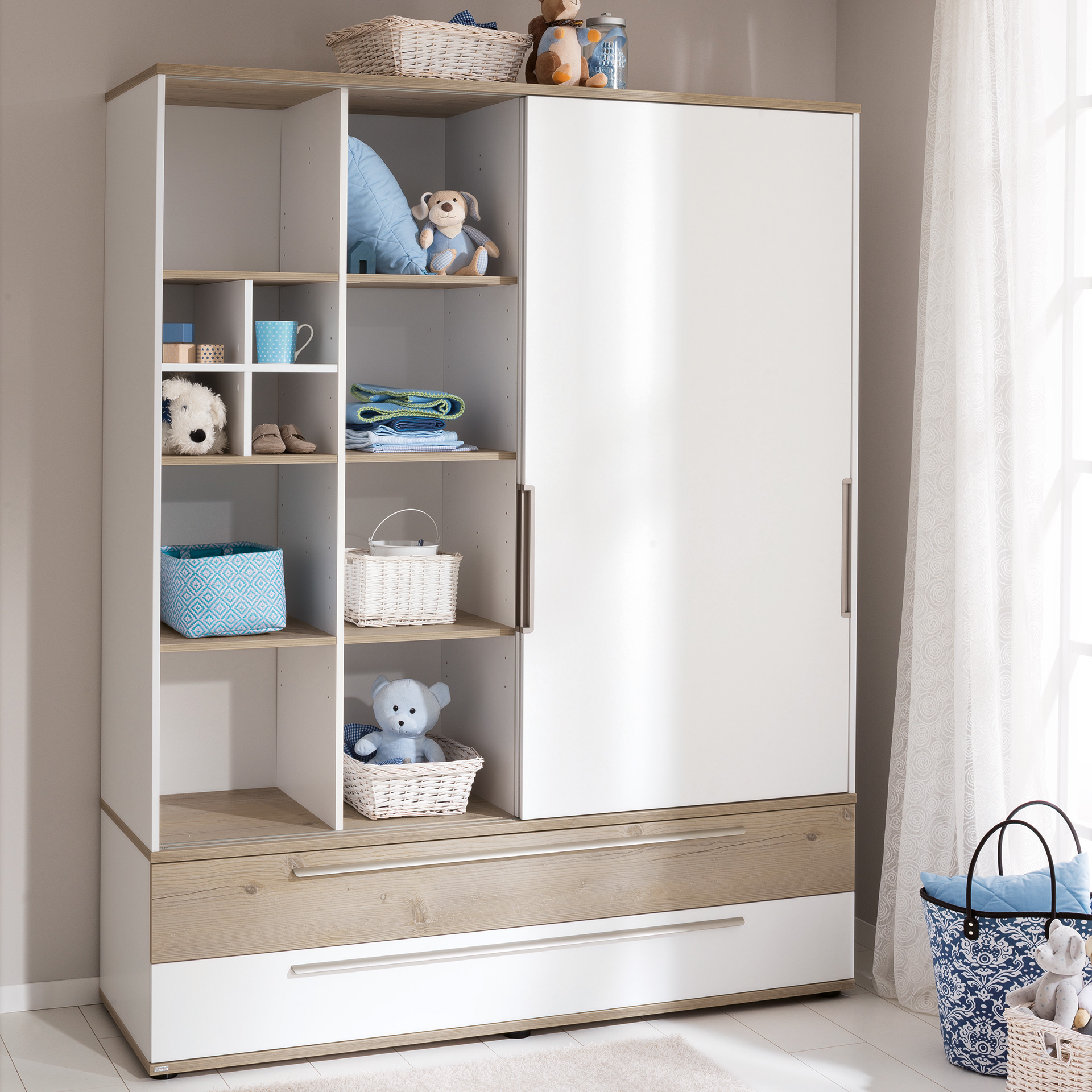 Wohlfühlen auf immer neue Weise – Schiebetüren für variable Designs. Stilvoller Stauraum für dich und dein Baby Babyzimmer brauchen ausreichend Stauraum für Spielzeug, Kleidung, Wickelutensilien und mehr. Mit der Möbelserie Carlo kannst du alles bequem verstauen – in breiten Schubladen, Regalen sowie Schränken mit variablen, leichtgängigen und kindersicheren Schiebetüren. Die Möbelfronten in Kreideweiß und Fichte-Vintage-Dekor setzen stilvolle Akzente. Individuelle Gestaltung – entscheide selbst. Die Kommode bietet mit Schubläden in Kreideweiß oder Holzdekor die Möglichkeit deiner persönlichen Gestaltung. Mache Wickelkommode und Kleiderschrank zu einem echten Blickfang, indem du den Holzanteil der Schubladen des Kleiderschranks und der Wickelkommode selbst bestimmst. Entscheide auch über die Position der Schiebetüren deines Regales selbst. Du kannst sie immer wieder neu anordnen und so den Look des Regales verändern.