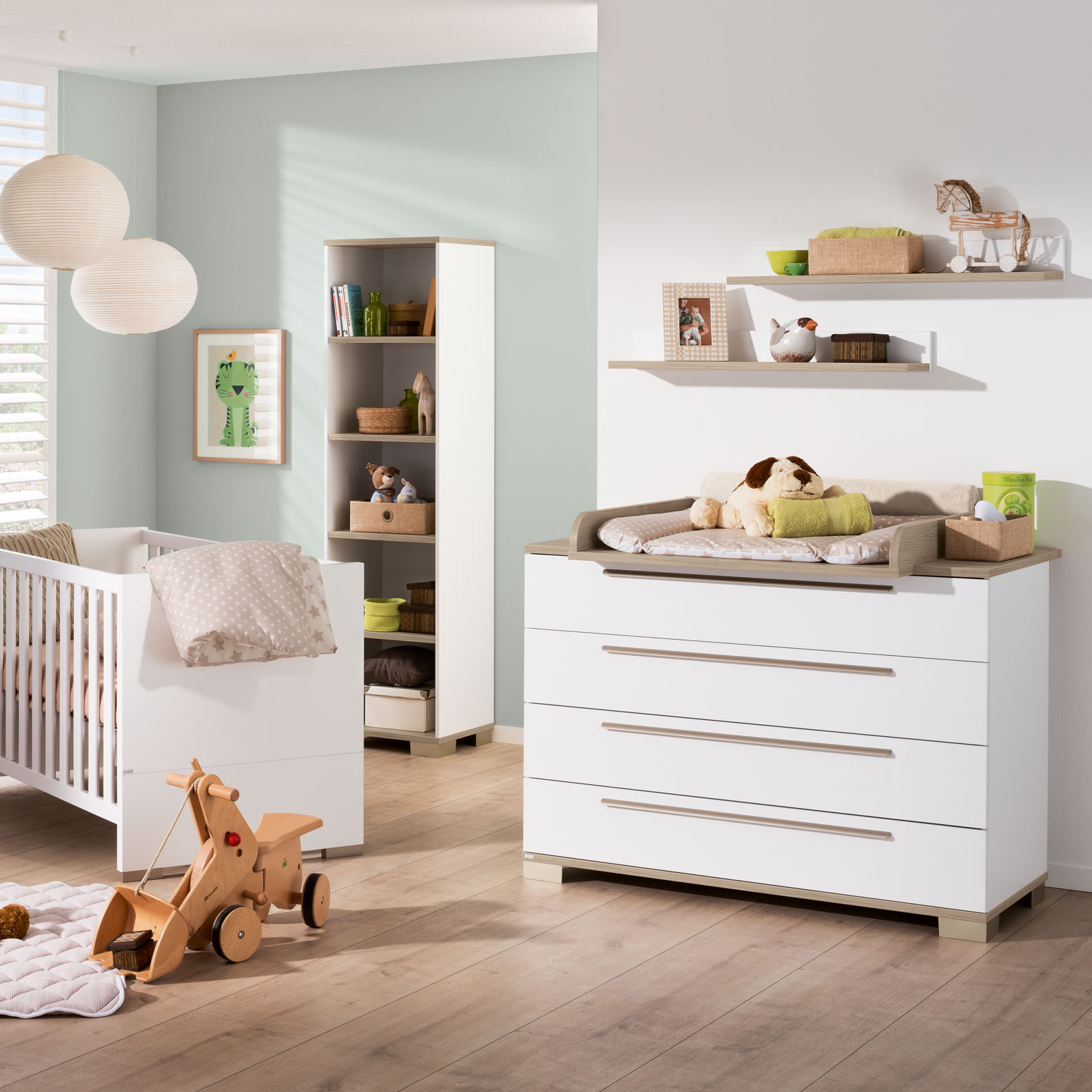 Wohlfühlen auf immer neue Weise – Schiebetüren für variable Designs. Stilvoller Stauraum für dich und dein Baby Babyzimmer brauchen ausreichend Stauraum für Spielzeug, Kleidung, Wickelutensilien und mehr. Mit der Möbelserie Carlo kannst du alles bequem verstauen – in breiten Schubladen, Regalen sowie Schränken mit variablen, leichtgängigen und kindersicheren Schiebetüren. Die Möbelfronten in Kreideweiß und Fichte-Vintage-Dekor setzen stilvolle Akzente. Individuelle Gestaltung – entscheide selbst. Die Kommode bietet mit Schubläden in Kreideweiß oder Holzdekor die Möglichkeit deiner persönlichen Gestaltung. Mache Wickelkommode und Kleiderschrank zu einem echten Blickfang, indem du den Holzanteil der Schubladen des Kleiderschranks und der Wickelkommode selbst bestimmst. Entscheide auch über die Position der Schiebetüren deines Regales selbst. Du kannst sie immer wieder neu anordnen und so den Look des Regales verändern.