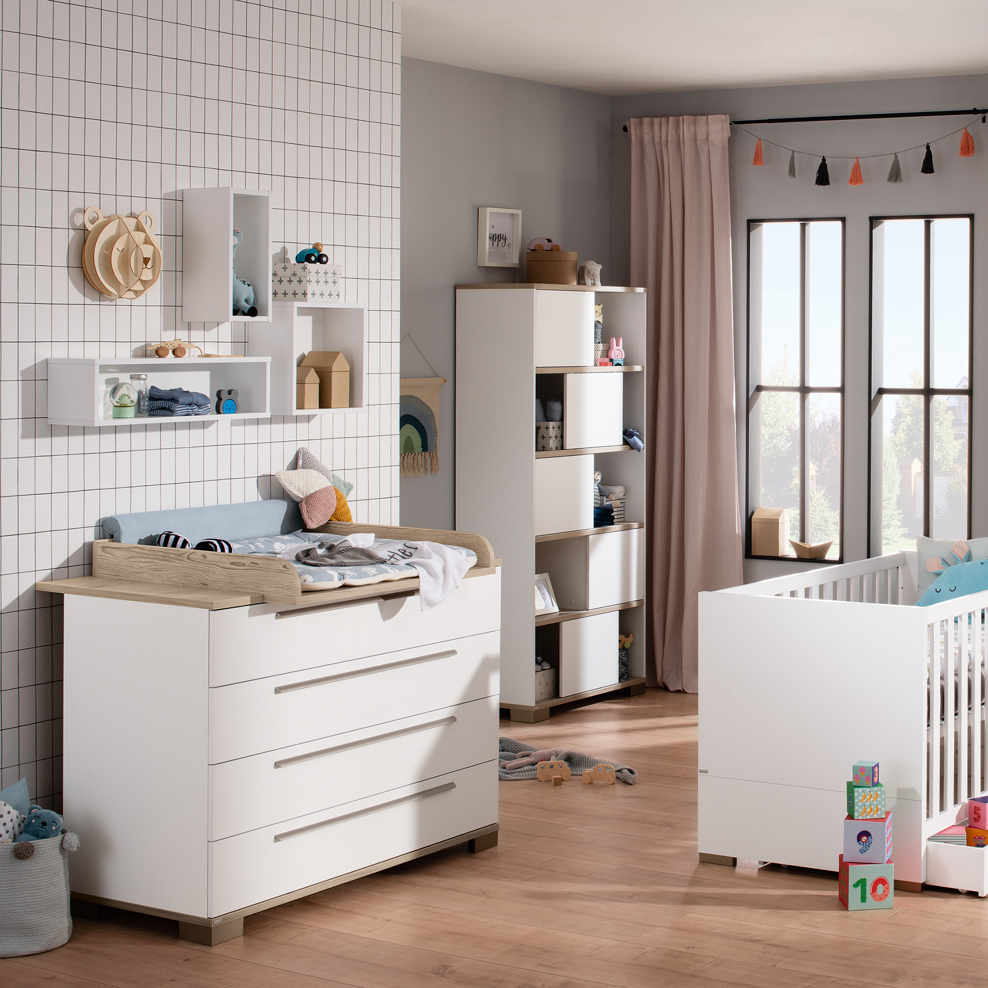Wohlfühlen auf immer neue Weise – Schiebetüren für variable Designs. Stilvoller Stauraum für dich und dein Baby Babyzimmer brauchen ausreichend Stauraum für Spielzeug, Kleidung, Wickelutensilien und mehr. Mit der Möbelserie Carlo kannst du alles bequem verstauen – in breiten Schubladen, Regalen sowie Schränken mit variablen, leichtgängigen und kindersicheren Schiebetüren. Die Möbelfronten in Kreideweiß und Fichte-Vintage-Dekor setzen stilvolle Akzente. Individuelle Gestaltung – entscheide selbst. Die Kommode bietet mit Schubläden in Kreideweiß oder Holzdekor die Möglichkeit deiner persönlichen Gestaltung. Mache Wickelkommode und Kleiderschrank zu einem echten Blickfang, indem du den Holzanteil der Schubladen des Kleiderschranks und der Wickelkommode selbst bestimmst. Entscheide auch über die Position der Schiebetüren deines Regales selbst. Du kannst sie immer wieder neu anordnen und so den Look des Regales verändern.