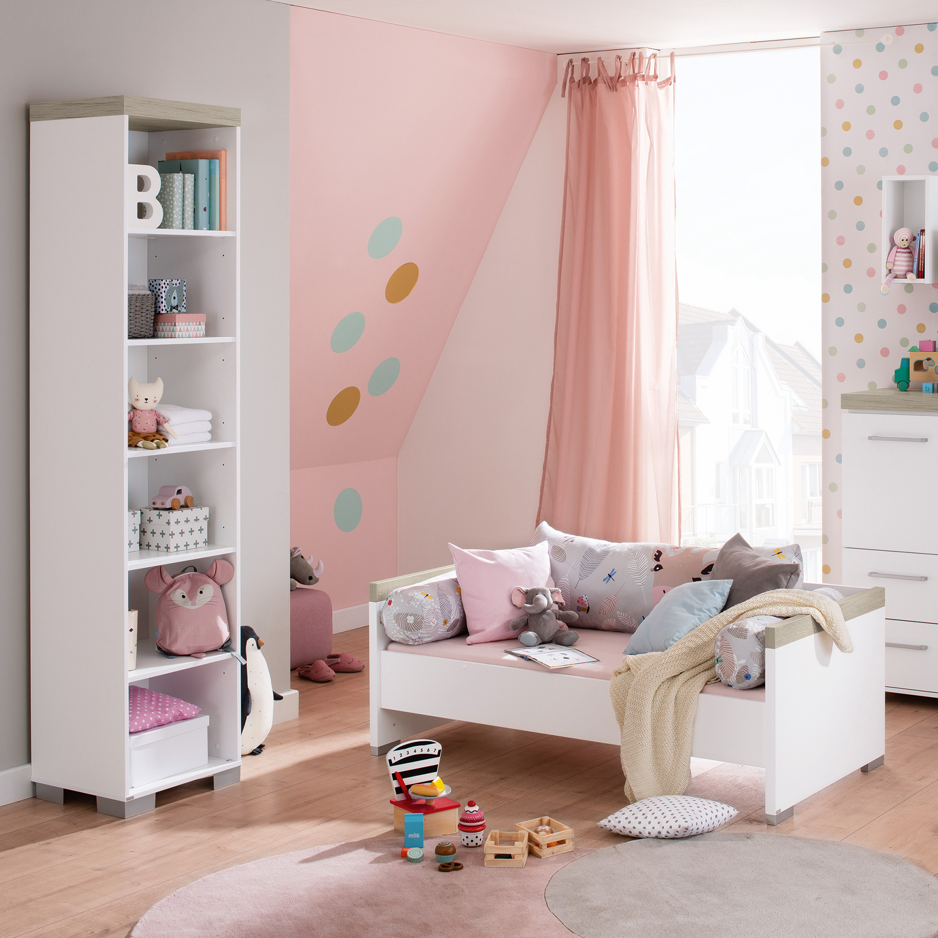 Modell:Kira Korpus und Front KreideweißDeckplatte und Fries ( je nach Type ) Eiche Nautik Nachbildung oder Eiche Nebraska NachbildungBeschreibung:Standregal8 offene Fächer Lieferbar in verschiedenen Ausführungen Außenmasse:ca. B 90,9 / H 147,0  / T 37,9 cm Hinweis: Weiteres Zubehör gehört jedoch nicht zum Lieferumfang, ist aber selbstverständlich gegen Mehrpreis erhältlich. Bei allen Paidi Betten ab einer Höhe von 90 cm ist eine Wandbefestigung unbedingt erforderlich. Bei Paidi Kommoden, Regalen und Kleiderschränken ab 90 cm Höhe ist ebenfalls eine Wandbefestigung erforderlich. Wir bitten um Beachtung!     PAIDI-KiraDie Möbelserie Kira des Kindermöbel-Produzenten Paidi beinhaltet Möbel für Babyzimmer, Kinderzimmer und Jugendzimmer. Die Deckplatten bei den Beimöbeln und Kleiderschränken sind abgesetzt und scheinen zu schweben. Das sorgt für eine leichte Optik. Außerdem hebt sich die Deckplatte auch farblich ab. Den Farbakzent können Sie in natürlich wirkender Nebraska-Eiche oder im Vintage-Style der Eiche-Nautik wählen. Der Korpus der einzelnen Möbelstücke ist in schönem Kreideweiß gehalten. Die metallenen Standfüße harmonieren mit den länglich gestalteten Griffen. Insgesamt ist das Design sehr linear und orientiert sich an Möbeln für Erwachsene. Die zurückhaltende Farbgebung lässt viel Raum für eigene Gestaltungs-Ideen.
