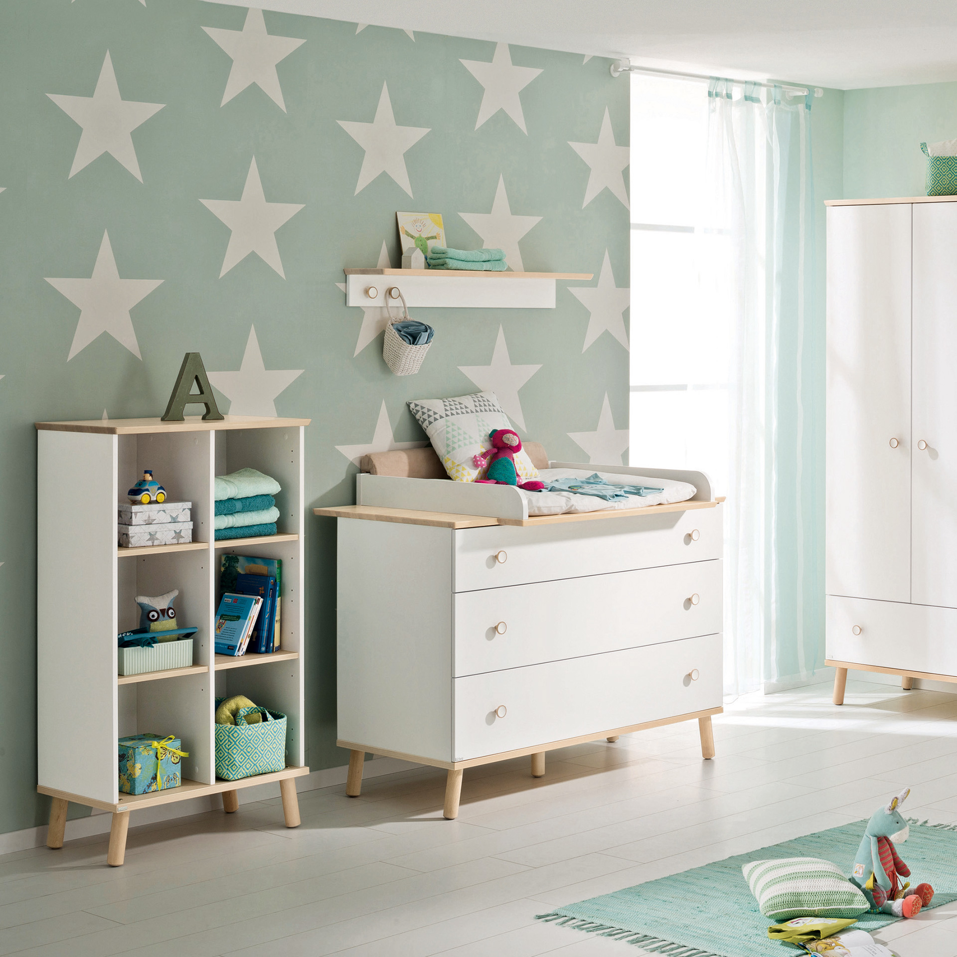 Harmonie im Kinderzimmer mit skandinavischem Birke-Naturlook. Hell mit Birke - Stimmungsaufheller Tag für Tag: Das natürliche und harmonische Ambiente im Kinderzimmer ist durch Flächen in Kreideweiß und Elemente in Birke-Optik geprägt. Klimaneutral hergestellt mit Holz aus nachhaltiger Forstwirtschaft und mit Lacken veredelt, die nach strenger Norm geprüft wurden. Spielbetten, Hochbetten, Etagenbetten - Je nach Höhe des Spielbetts (90, 120 und 160 cm) lässt sich der Raum darunter zum Spielen und Verstauen und beim Etagenbett (160 cm) auch zum Schlafen nutzen. Unters Hochbett (180 cm) passt sogar platzsparend ein Schreibtisch. Kojenbett mit Stauraum - Unters Kojenbett in den Maßen 90 x 200 cm oder 120 x 200 cm passt ein Unterschiebebett für Besuch über Nacht. Oder auch Rollregale und Rollboxen, die mit Sitzkissen als mobiler Platz dienen können. Das Unterschieberegal hat vier Fächer und kann von beiden Seiten unters Bett geschoben werden.