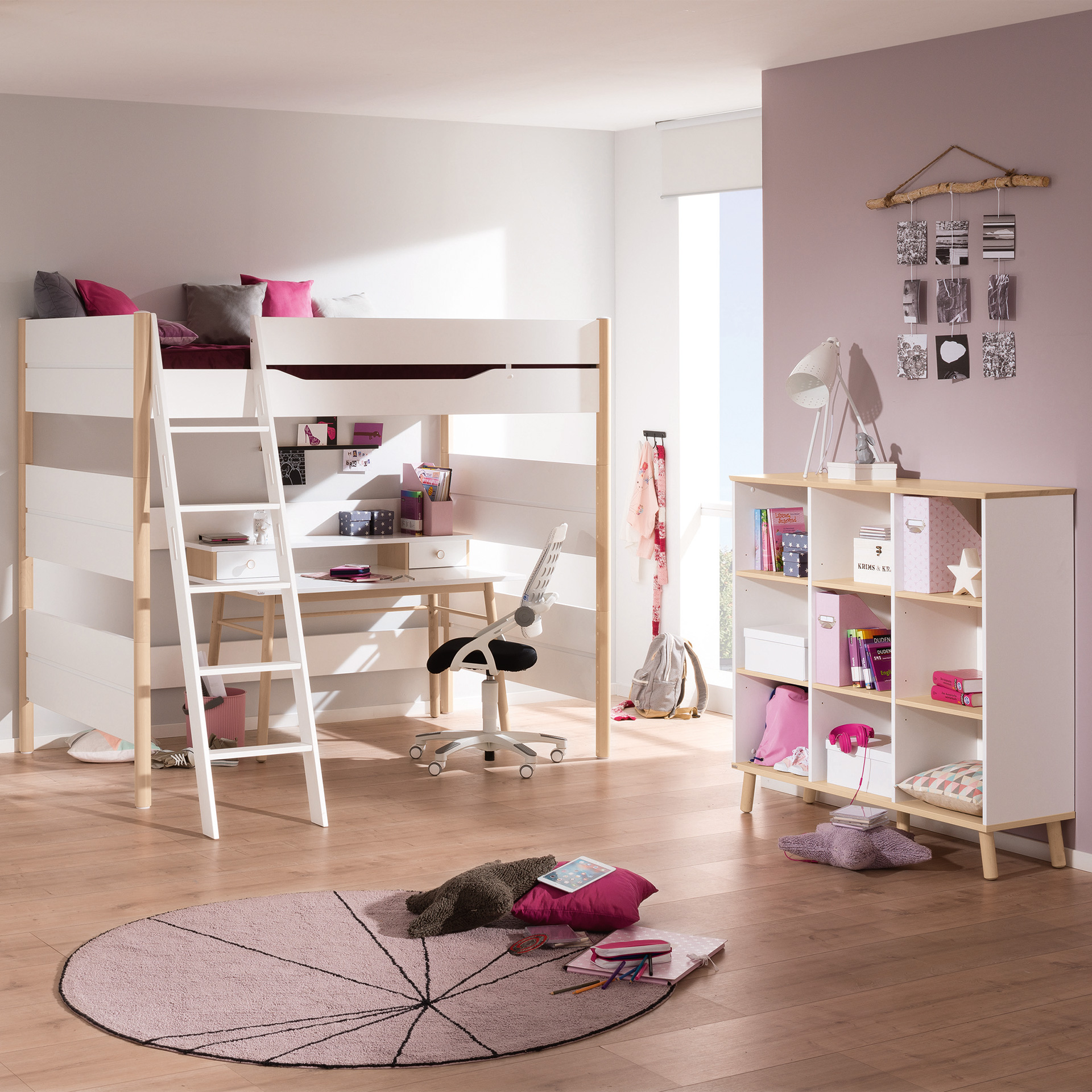 Harmonie im Kinderzimmer mit skandinavischem Birke-Naturlook. Hell mit Birke - Stimmungsaufheller Tag für Tag: Das natürliche und harmonische Ambiente im Kinderzimmer ist durch Flächen in Kreideweiß und Elemente in Birke-Optik geprägt. Klimaneutral hergestellt mit Holz aus nachhaltiger Forstwirtschaft und mit Lacken veredelt, die nach strenger Norm geprüft wurden. Spielbetten, Hochbetten, Etagenbetten - Je nach Höhe des Spielbetts (90, 120 und 160 cm) lässt sich der Raum darunter zum Spielen und Verstauen und beim Etagenbett (160 cm) auch zum Schlafen nutzen. Unters Hochbett (180 cm) passt sogar platzsparend ein Schreibtisch. Kojenbett mit Stauraum - Unters Kojenbett in den Maßen 90 x 200 cm oder 120 x 200 cm passt ein Unterschiebebett für Besuch über Nacht. Oder auch Rollregale und Rollboxen, die mit Sitzkissen als mobiler Platz dienen können. Das Unterschieberegal hat vier Fächer und kann von beiden Seiten unters Bett geschoben werden.