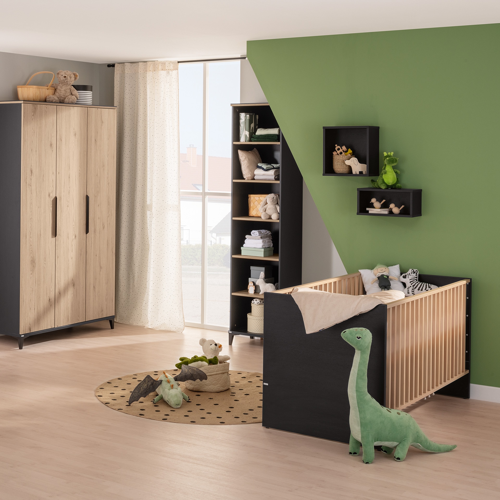 Industrial Style. Starke Kontraste fürs Kinderzimmer Tomke zeichnet sich durch das Zusammenspiel zweier Farbtöne aus: Schwarze Korpusse rahmen die Fronten aus warmem Holzdekor ein und verleihen den Möbeln einen urbanen Look. Die holzfarbenen Einlegeböden scheinen in den schwarzen Regalen zu schweben und setzen Schönes sowie Nützliches in Szene. So gestaltest du ein zeitloses Babyzimmer, das später auch als Grundlage für ein Kinder- oder Jugendzimmer funktioniert. Babybett Tomke – innovativ und komfortabel. Unsere Babybetten sind mit dem patentierten PAIDI-Schlupfsprossenmechanismus ausgestattet. Damit lassen sich die Gitterstäbe leicht herausnehmen und genauso komfortabel wieder einsetzen.