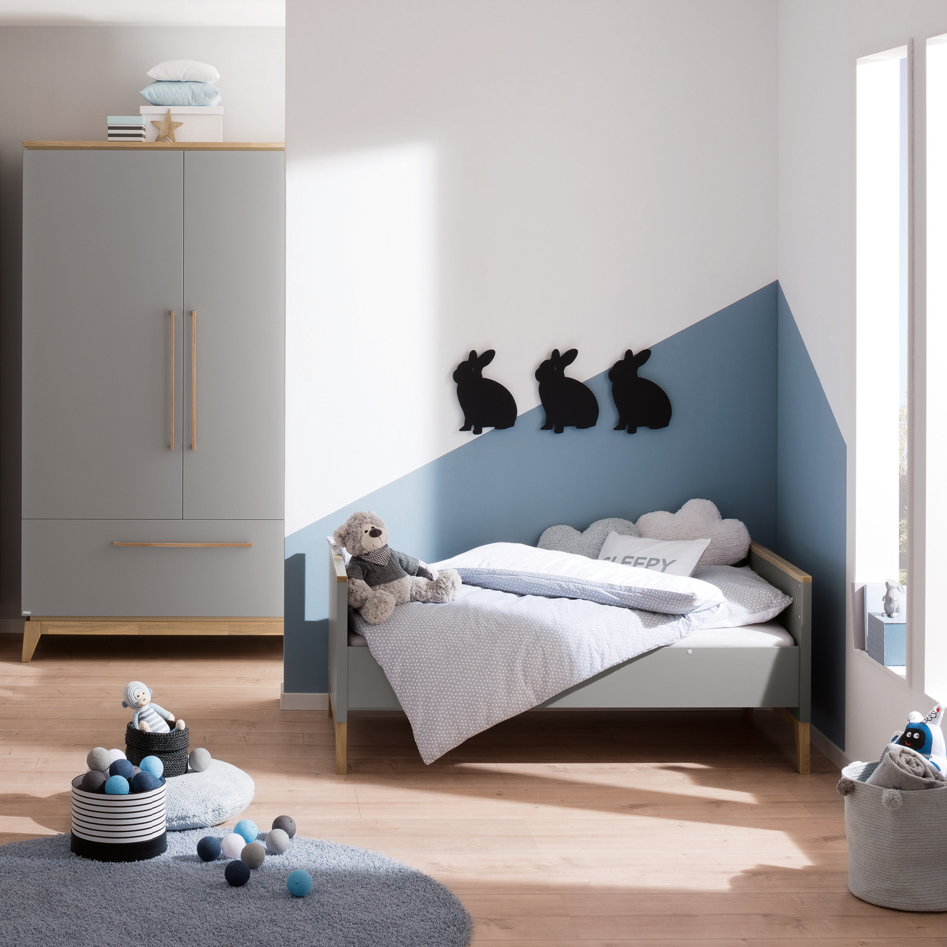 Trend im Kinderzimmer: hochwertige Möbel in nordisch inspiriertem Schiefergrau. Reizvolle Kontraste So sehen zeitgemäße Kinderzimmer aus: nordisches Design mit Liebe zum Detail und schönen Kontrasten in Schiefergrau und Eiche. Aus nachhaltiger Forstwirtschaft klimaneutral hergestellt. Spielbett, Hochbett, Etagenbett Ein Paradies für Mädchen und Jungs: Unterm Spielbett mit seiner Höhe von 120 oder 160 cm entsteht hinterm Vorhang-Set eine Abenteuerwelt. Unter das Hochbett mit 180 cm Höhe passt sogar ein Schreibtisch. Das Etagenbett bietet gleich zwei Schlafmöglichkeiten, mit Unterschiebebett sogar drei. Jugendbett in drei Breiten Richtig stylish wie für Erwachsene sieht die Traumliege in den Maßen 90, 120 und 140 x 200 cm mit ihren abgeschrägten Bettpfosten aus. Sie ist erhältlich in Schiefergrau kombiniert mit Eiche massiv oder komplett in Eiche massiv, mit oder ohne gepolstertem Betthaupt. So entstehen verschiedene Looks. Komfortable Schiebetürenschränke Die Schränke mit Schiebetüren sind in zwei Breiten erhältlich und bieten extra viel Platz. Das original PAIDI Slide System sorgt für höchste Sicherheit und schützt die Finger vorm Einklemmen. Die Türen schließen sanft und leise. Nordischer Wohlfühl-Look im Kinder- und Jugendzimmer.